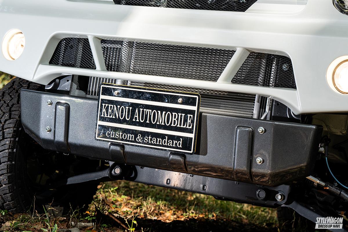 装着エアロはフロントバンパー2型(フォグランプありバージョン)。1型との違いはグリル両端のガード部分だ。これがあることでタンクの目隠しになるだけでなく、吸気系にゴミや水滴が入らないという副次的効果も期待できるという。そのためいつでもきれいな空気を吸い込めるというわけだ。組み合わせたのはスキッドバンパー。リフトアップで見えやすくなってしまう腹下を隠しつつ、オフロード感を大きく高めるアイテムとなっている。ちなみにホイールは14×6.5J、タイヤは165/65-14。ゴツゴツとしたブロックタイヤも「らしさ」を高めるのに一役買っている。