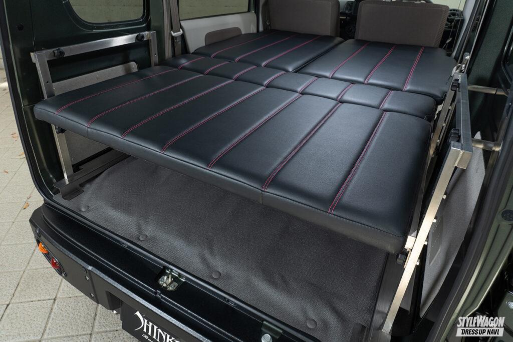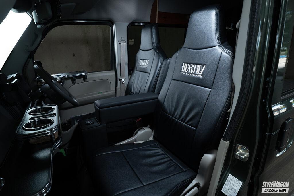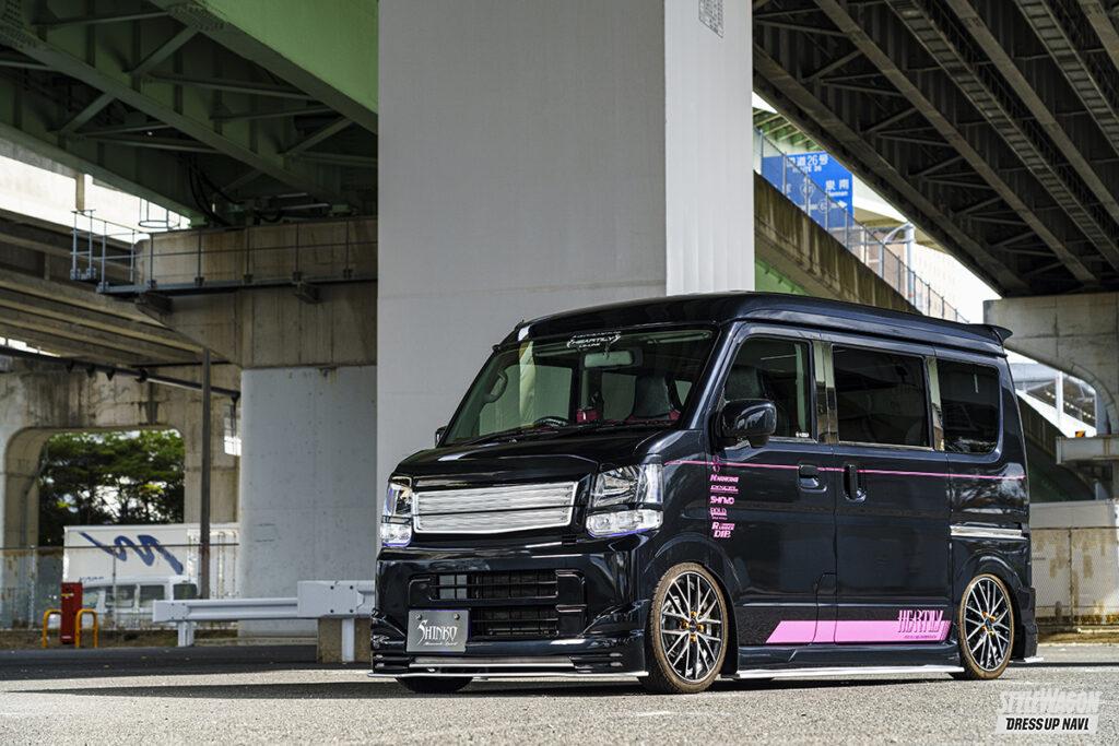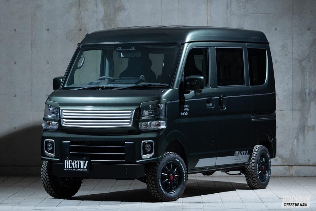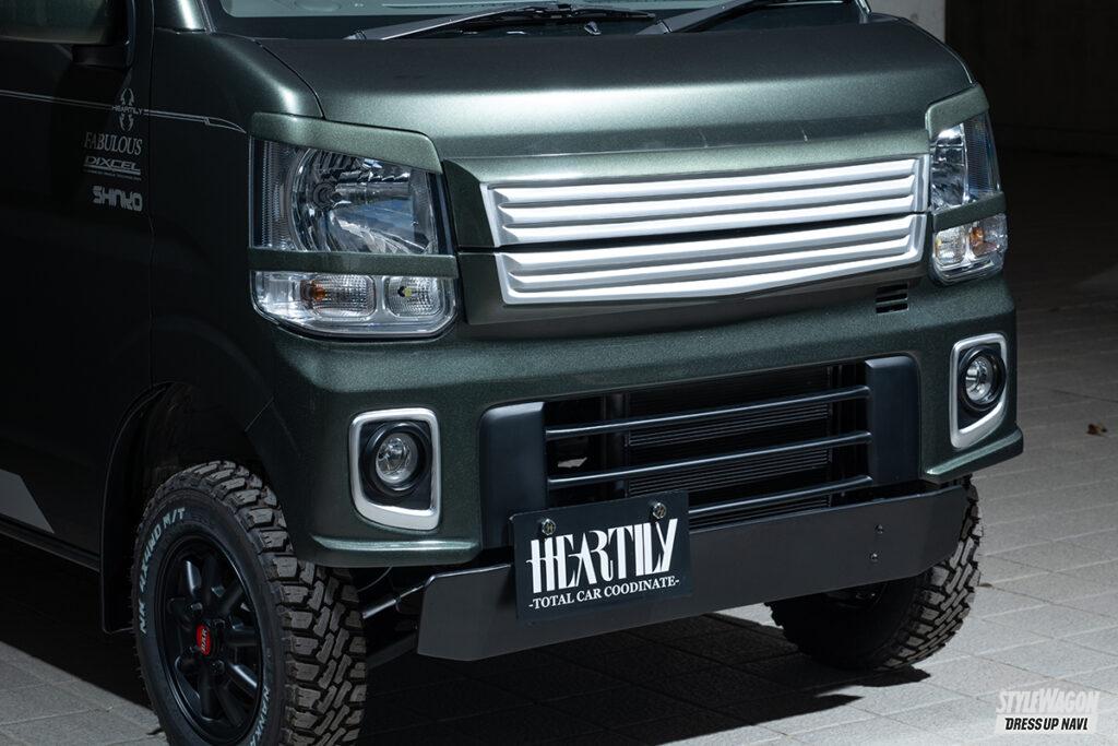 DA17系エブリイワゴンのバンパーを意識して作られた“ワゴンルック・ショートバンパー・バージョン”。より「らしさ」を演出するフォグランプとテールランプは、ワゴン純正を流用。そのため、エブリイ バンに装着しても、ワゴンのように見えるのが一番のメリットと言って良いだろう(バンに装着する場合は、純正フォグとワゴン純正テールを用意する必要あり)。また、バンパーがショート化されたことでタイヤが良く見えるようになり、実際にはチョイアゲでもかなりリフトアップしているように見えるのも高ポイント。現在、64エブリイ用も開発中。こちらも17ワゴンに見えるようになる仕上がりだという。