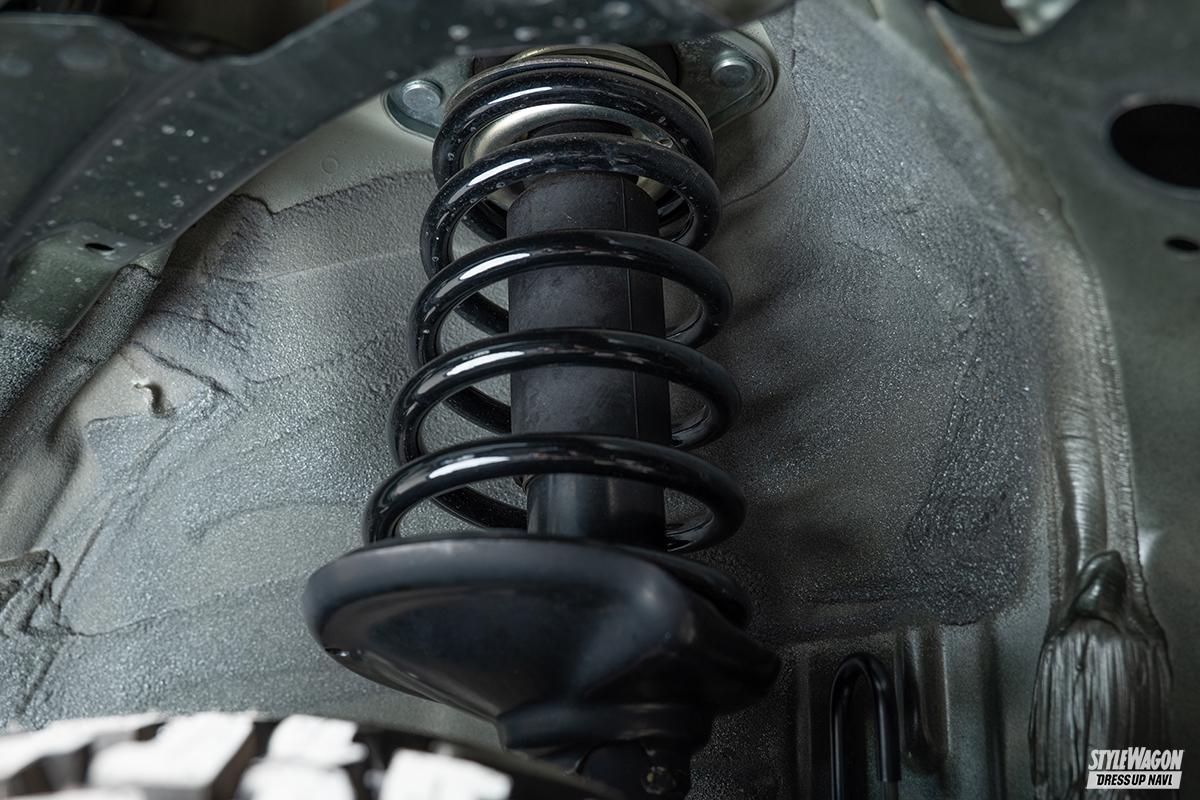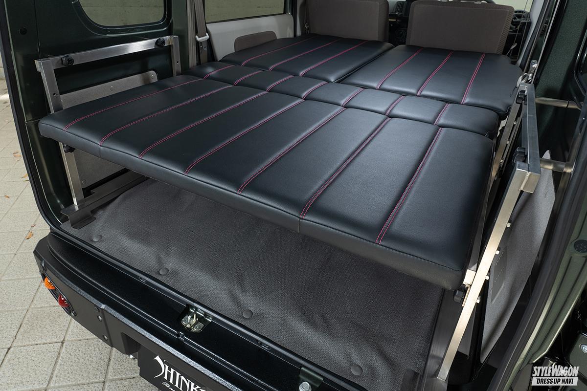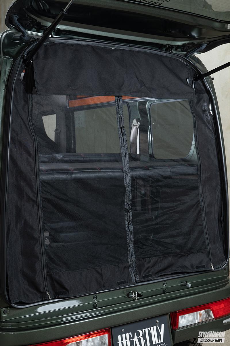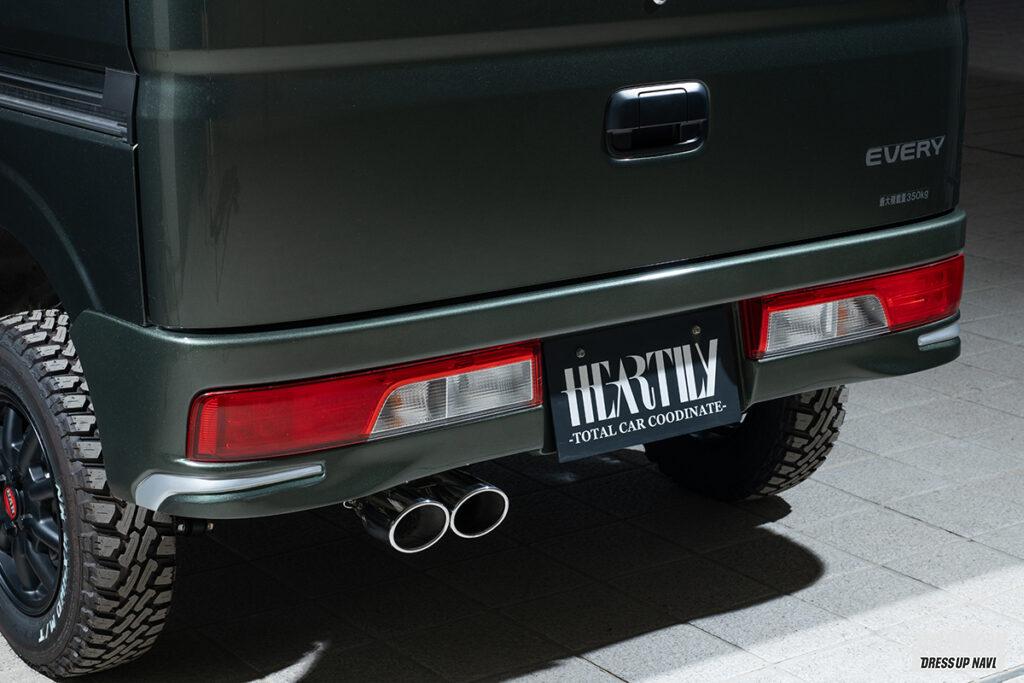 DA17系エブリイワゴンのバンパーを意識して作られた“ワゴンルック・ショートバンパー・バージョン”。より「らしさ」を演出するフォグランプとテールランプは、ワゴン純正を流用。そのため、エブリイ バンに装着しても、ワゴンのように見えるのが一番のメリットと言って良いだろう(バンに装着する場合は、純正フォグとワゴン純正テールを用意する必要あり)。また、バンパーがショート化されたことでタイヤが良く見えるようになり、実際にはチョイアゲでもかなりリフトアップしているように見えるのも高ポイント。現在、64エブリイ用も開発中。こちらも17ワゴンに見えるようになる仕上がりだという。