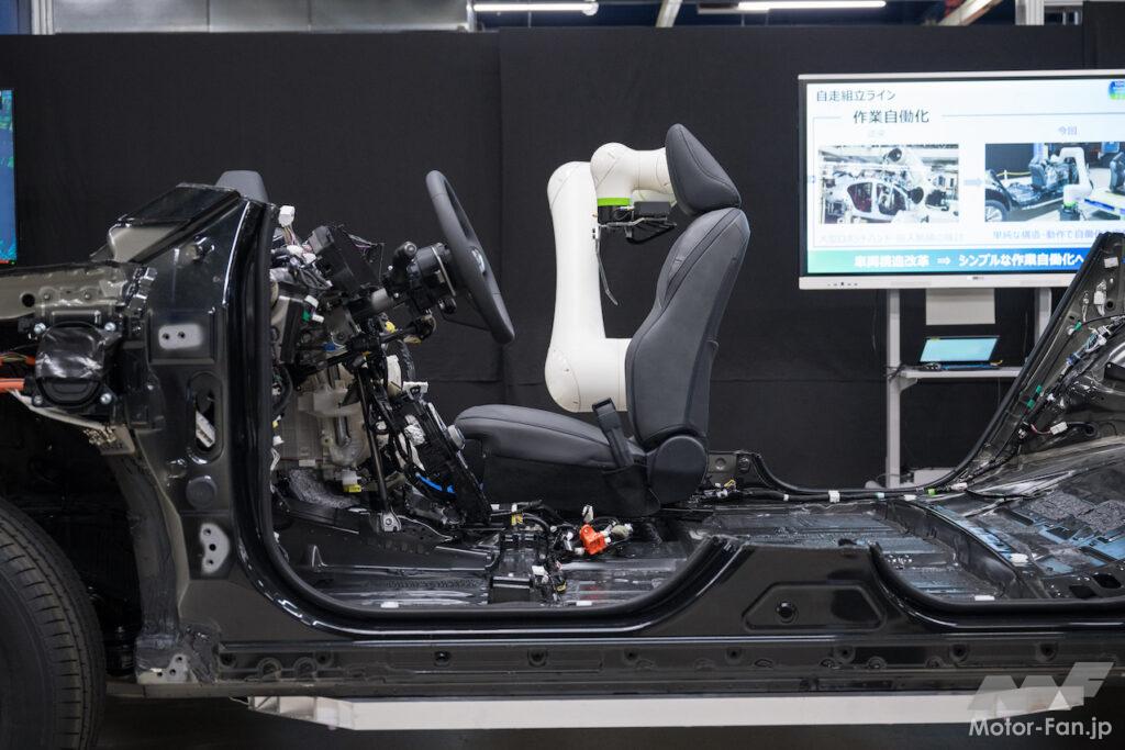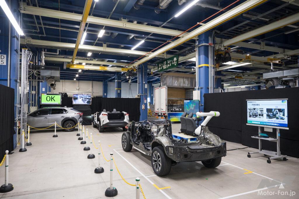 「作業の効率化、生産性の向上、リードタイムの短縮は、TPS(トヨタ生産方式)の最も得意とするところです」とトヨタは説明。これまでのクルマづくりで培ってきた経験と技能に新技術を組み合わせた新たなモノづくりのチャレンジが、コンベアレスかつ製品が自走し、作業自動化が取り入れられた次世代BEVラインだ。