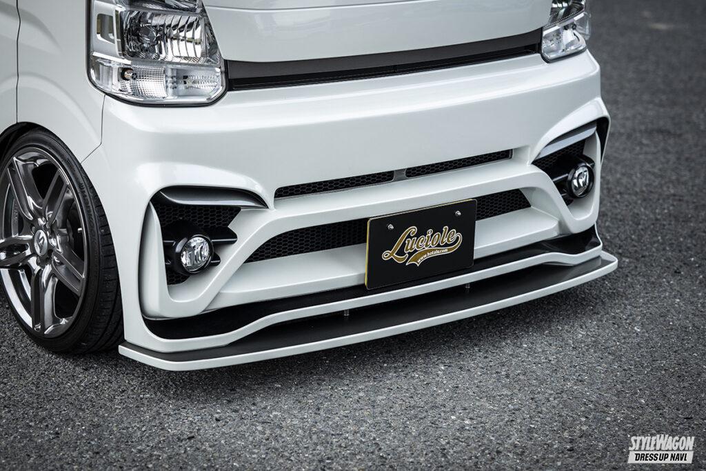 フォグを囲む最も外側の造形はアールを活かした膨らみで表現。中央から伸ばした直線の横バーはフォグ直前で急激に下へと向きを変え、そのままフォグを包み込むように跳ね上げる。そしてボトムに向けて層を重ねたルーバーデザイン。ルシオールのフルバンパーは他にはない美しさを備えたエアロとなっている。また、リアもフロントに合わせてインパクトの強い造形をいくつも投入。中央にはディフューザーを配し、左右には2本出しのマフラー。テールランプとも相まって、視線をボトムに引きつける効果を担っている。誰とも被らないエアロを探しているなら、ルシオールはオススメだ。