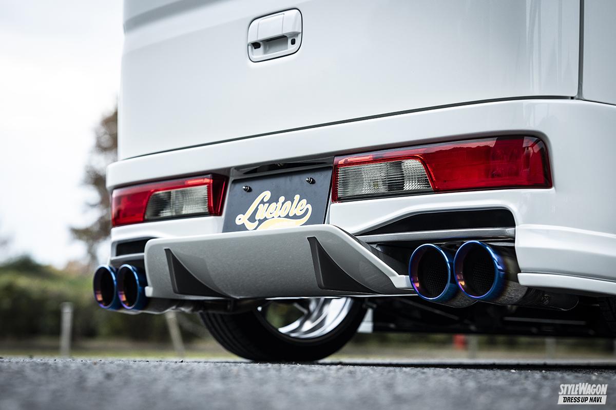 フォグを囲む最も外側の造形はアールを活かした膨らみで表現。中央から伸ばした直線の横バーはフォグ直前で急激に下へと向きを変え、そのままフォグを包み込むように跳ね上げる。そしてボトムに向けて層を重ねたルーバーデザイン。ルシオールのフルバンパーは他にはない美しさを備えたエアロとなっている。また、リアもフロントに合わせてインパクトの強い造形をいくつも投入。中央にはディフューザーを配し、左右には2本出しのマフラー。テールランプとも相まって、視線をボトムに引きつける効果を担っている。誰とも被らないエアロを探しているなら、ルシオールはオススメだ。