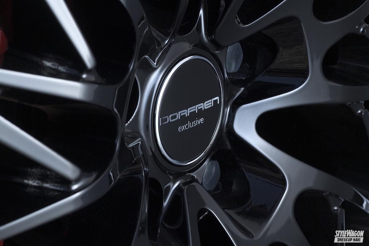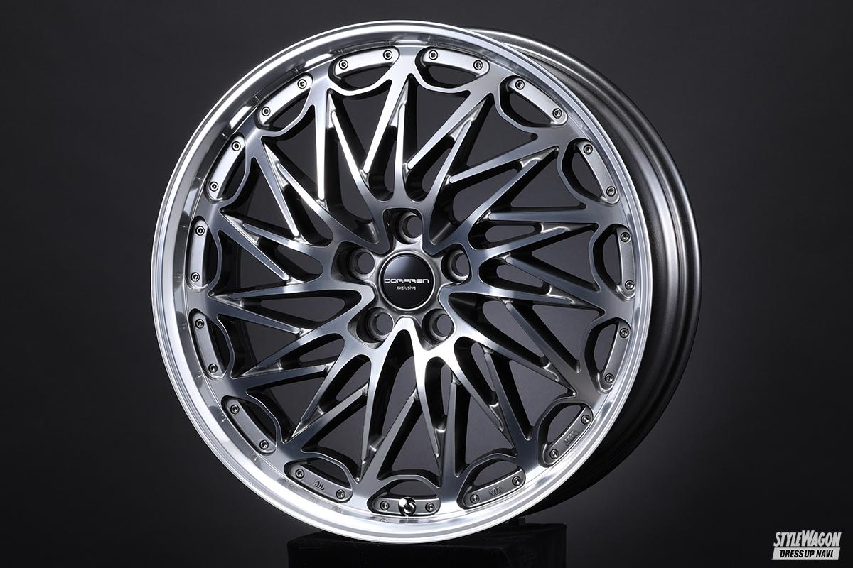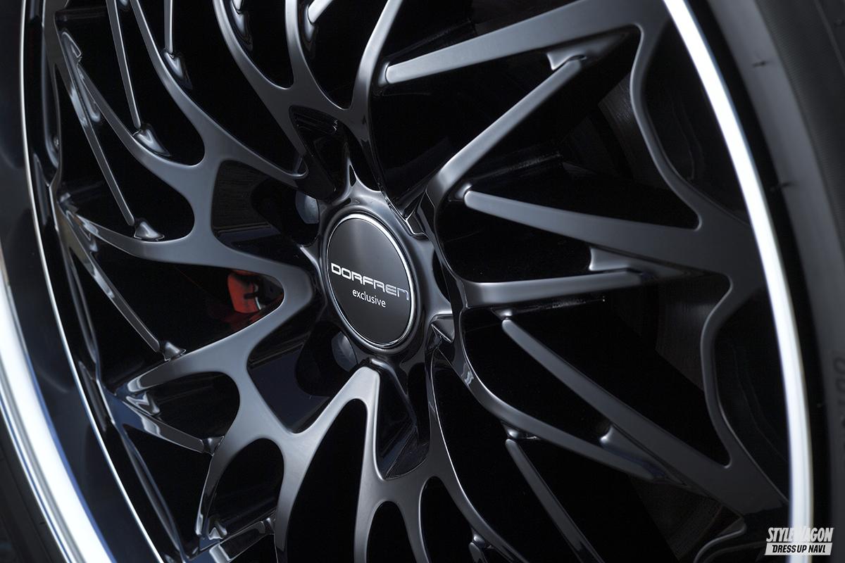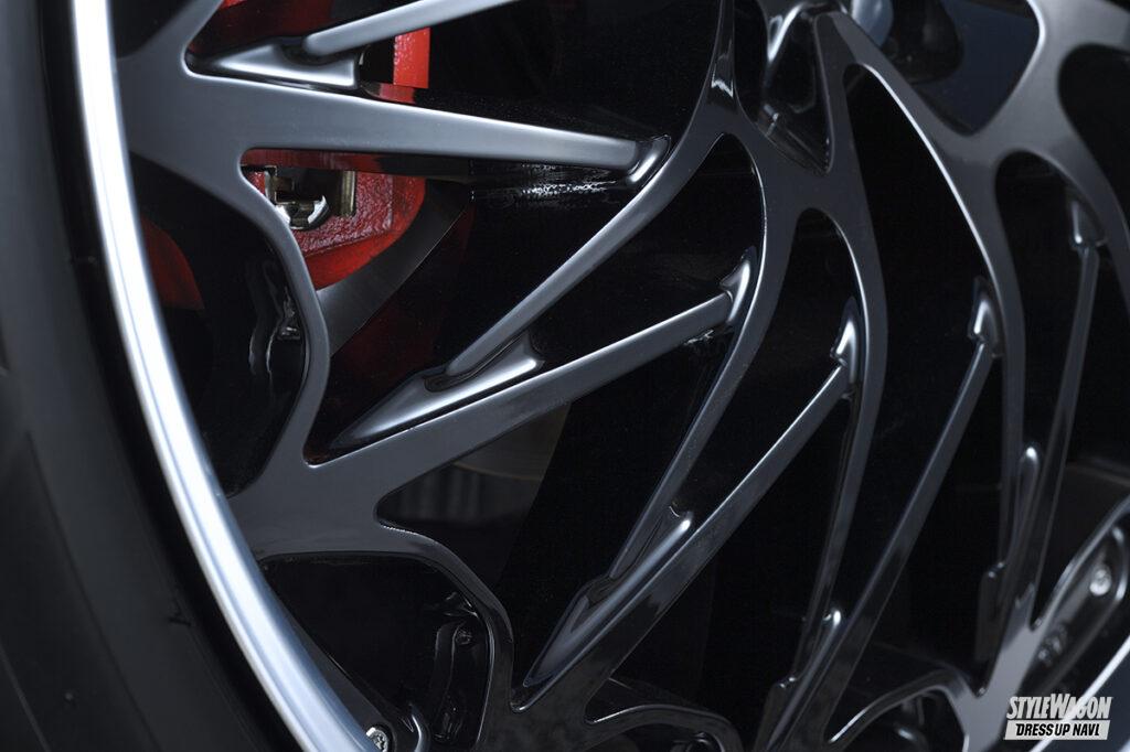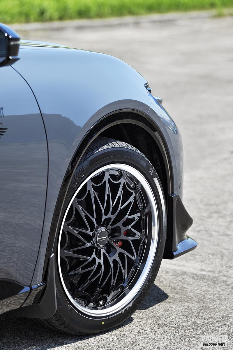 当モデルが属する『ドルフレンエクスクルーシブ』は、トピーのフラッグシップ『ドルフレン』のさらに上を行くプレミアムなシリーズ。レクサス車、40アル・ヴェルなどトヨタの上級車等々、ターゲット車種を絞っているシリーズである点も特徴だ。そんな上級車に合わせるべく、どう仕上げたのか? 前述の通り躍動感溢れる造形に加え、リムを強調する設計となっている点がポイント。つまりリムの奥行き感は十分で、さらにリム部には塗分けまで施されているので、1ピース構造ながらマルチピースを彷彿させる設計なのだ。この辺りも、上級車に相応しい要素と言えるかもしれない。
