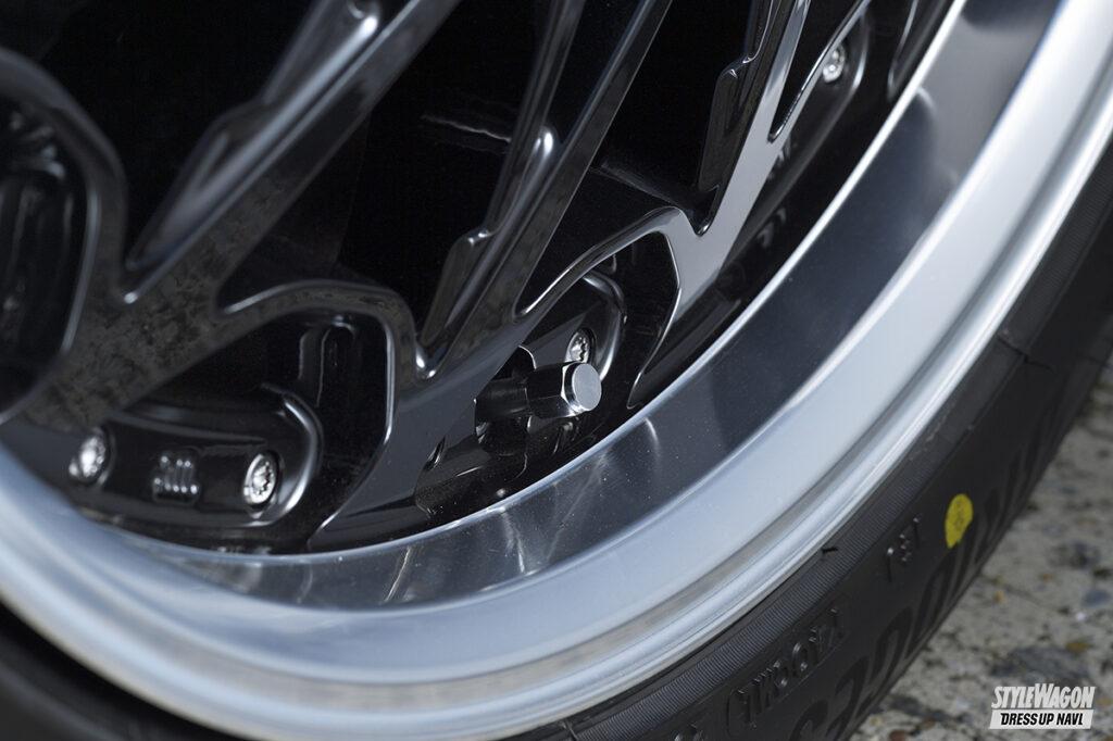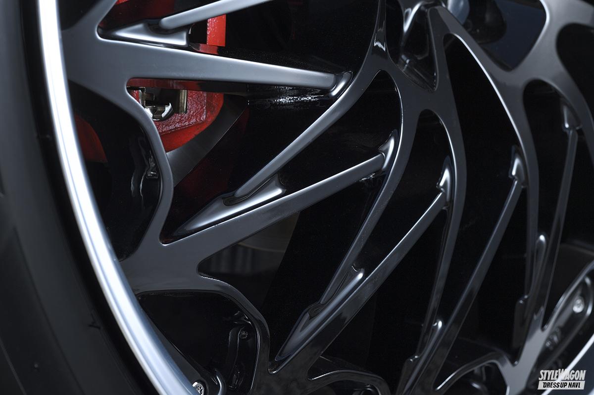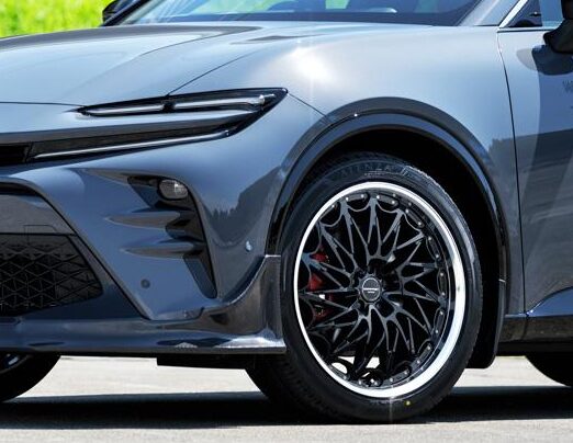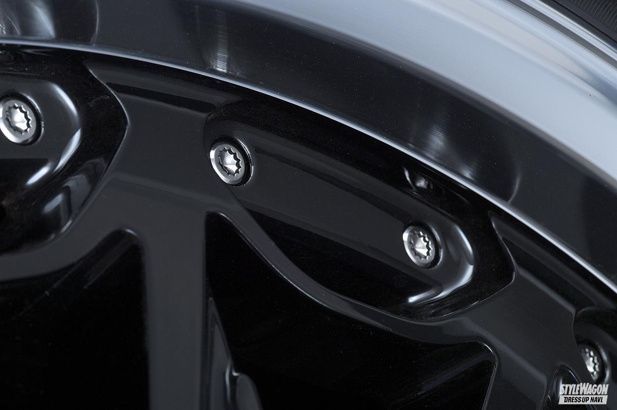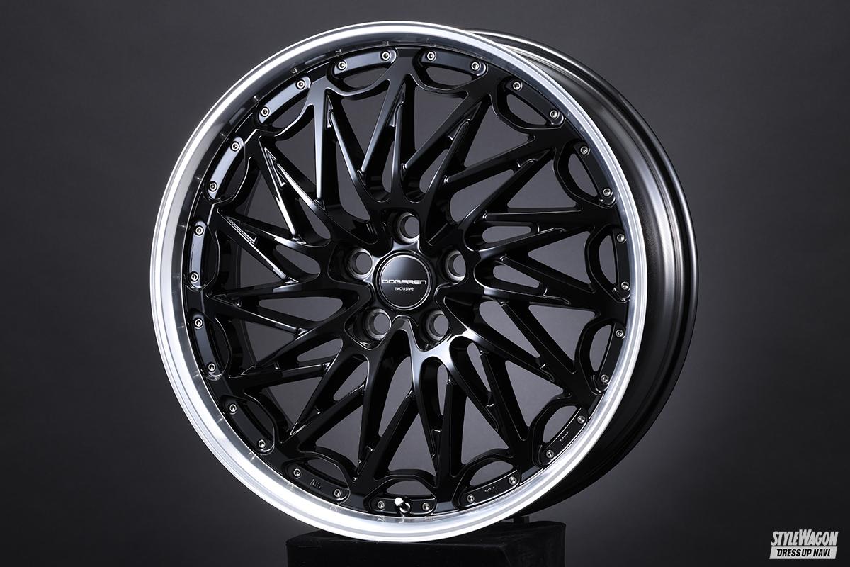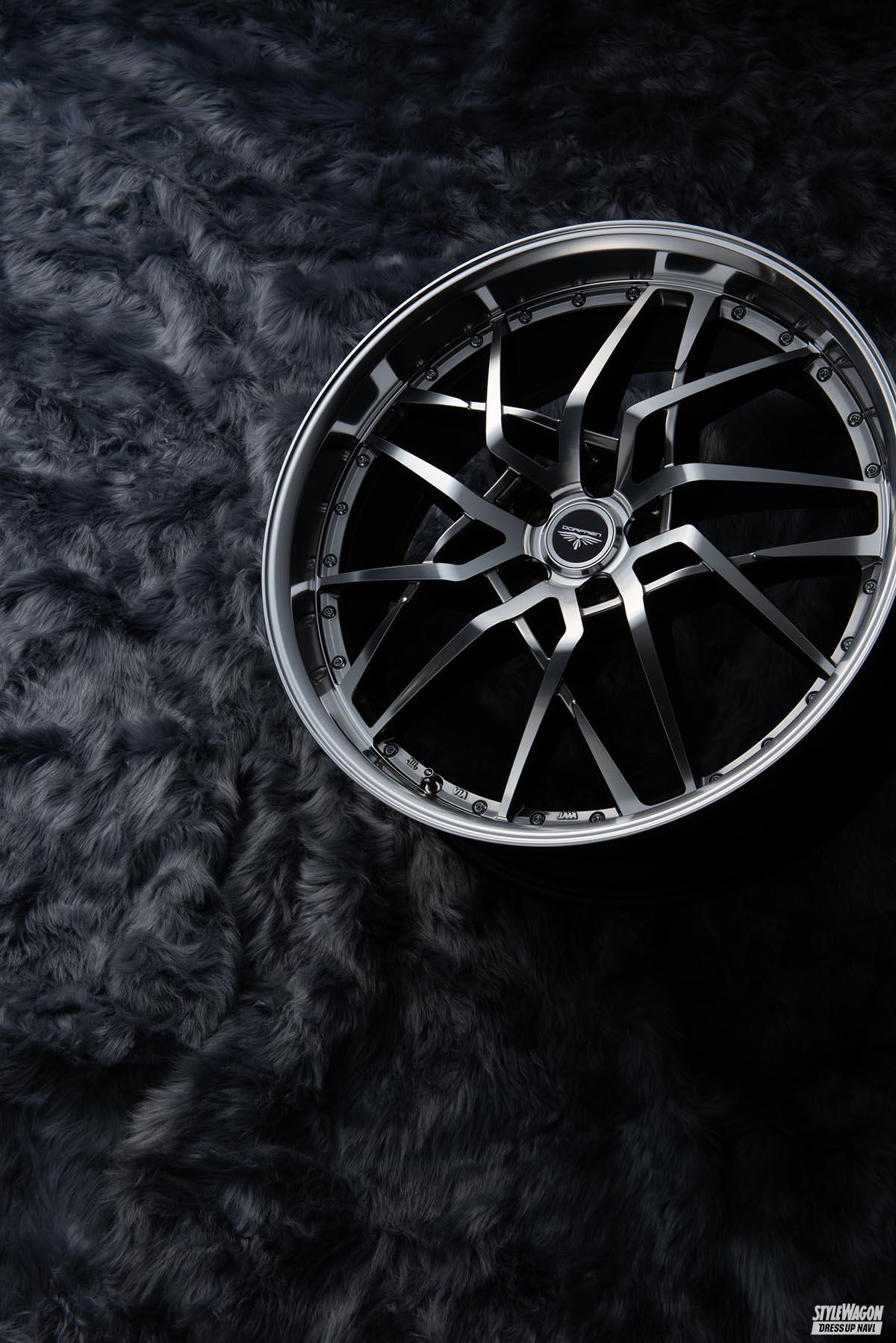 当モデルが属する『ドルフレンエクスクルーシブ』は、トピーのフラッグシップ『ドルフレン』のさらに上を行くプレミアムなシリーズ。レクサス車、40アル・ヴェルなどトヨタの上級車等々、ターゲット車種を絞っているシリーズである点も特徴だ。そんな上級車に合わせるべく、どう仕上げたのか? 前述の通り躍動感溢れる造形に加え、リムを強調する設計となっている点がポイント。つまりリムの奥行き感は十分で、さらにリム部には塗分けまで施されているので、1ピース構造ながらマルチピースを彷彿させる設計なのだ。この辺りも、上級車に相応しい要素と言えるかもしれない。