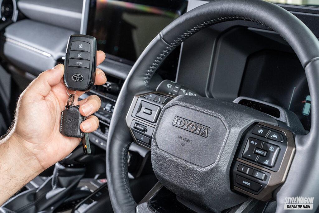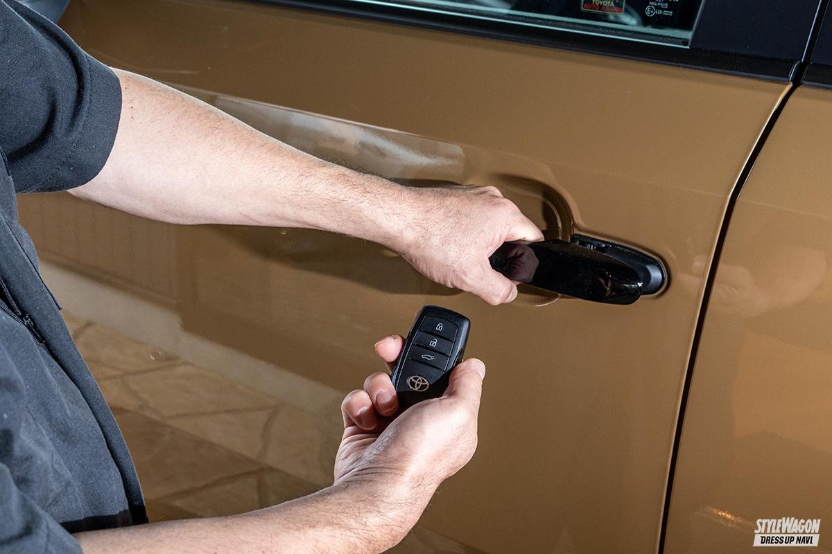 上段でも記しているようにデジタル式のカーセキュリティにはリモコンが存在せず、純正スマートキーに小さなキーフォブを付帯させておくだけ。このシンプルさが機械モノにめっぽう弱い奥さまにも好評なんですって!!