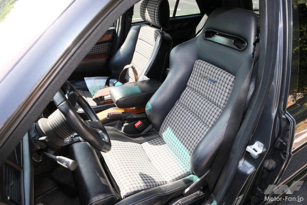 最大のポイントはドライバーズシートで、レカロのLXの座面にSRIIIの背もたれを組み合わせたものを自作。いずれも純正に合わせたチェック柄も再現している。さらに、シートレールは純正を使うことで電動調整を生かしている。助手席側シートと見比べてみても純正と変わらぬ仕上がりだ。