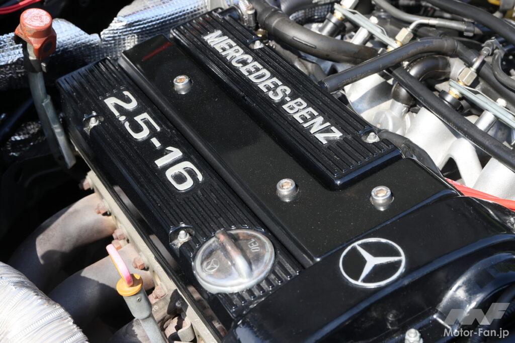 190E2.5-16の特徴のひとつがM102型直列4気筒DOHCエンジン。190E2.3-16の2297ccからストロークアップにより排気量を2498ccに高め、出力は175psから200ps、トルクは22.9kgmから24.5kgmに向上させている。