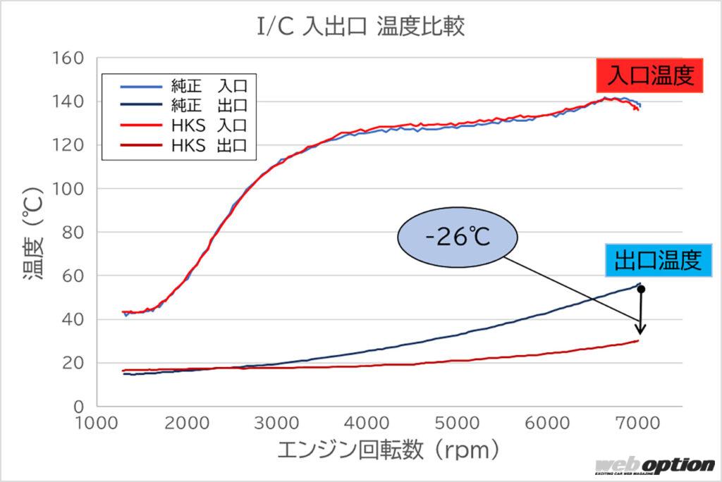 「ブーストアップするとさらに吸気温度は上昇するので、絶対的な容量が足りなくなってきますね。また吸気温度が高くなりすぎると補正が入り、サーキットで徐々にパワーダウンしてしまうなどの弊害が出る恐れもあります」とは、HKS開発部の淵沢さん。