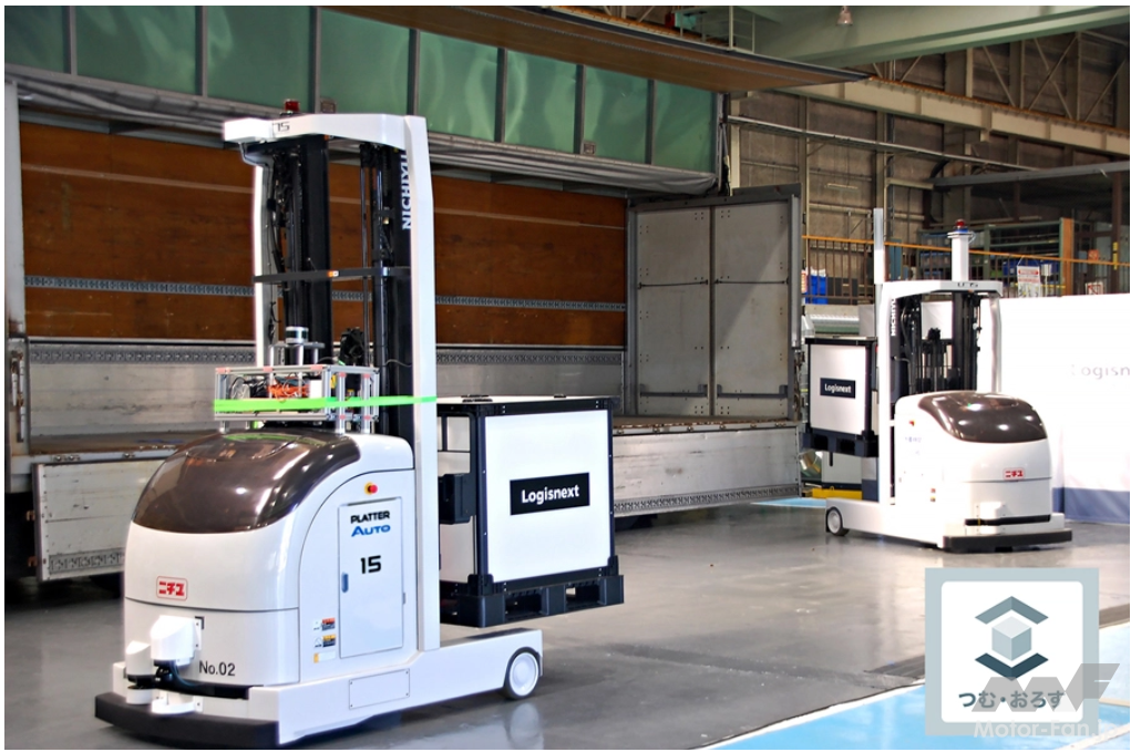 将来的には、荷物が乗ったパレット(荷役台)をAGFが自動で取り上げ、トラックの荷台へ直接積み込む一連のシステムを構築する。トラックへのパレット積み込みは、荷積みのスピードやトラックの停止位置、トラック内のパレットの設置位置などに高い精度を求められることから、これまで有人フォークリフトでの運用が一般的だったが、三菱重工が培った自律化・知能化技術と三菱ロジスネクストの自動化技術を活用することで、トラックの荷積み・荷降ろしにおける省人化と省力化に貢献する。