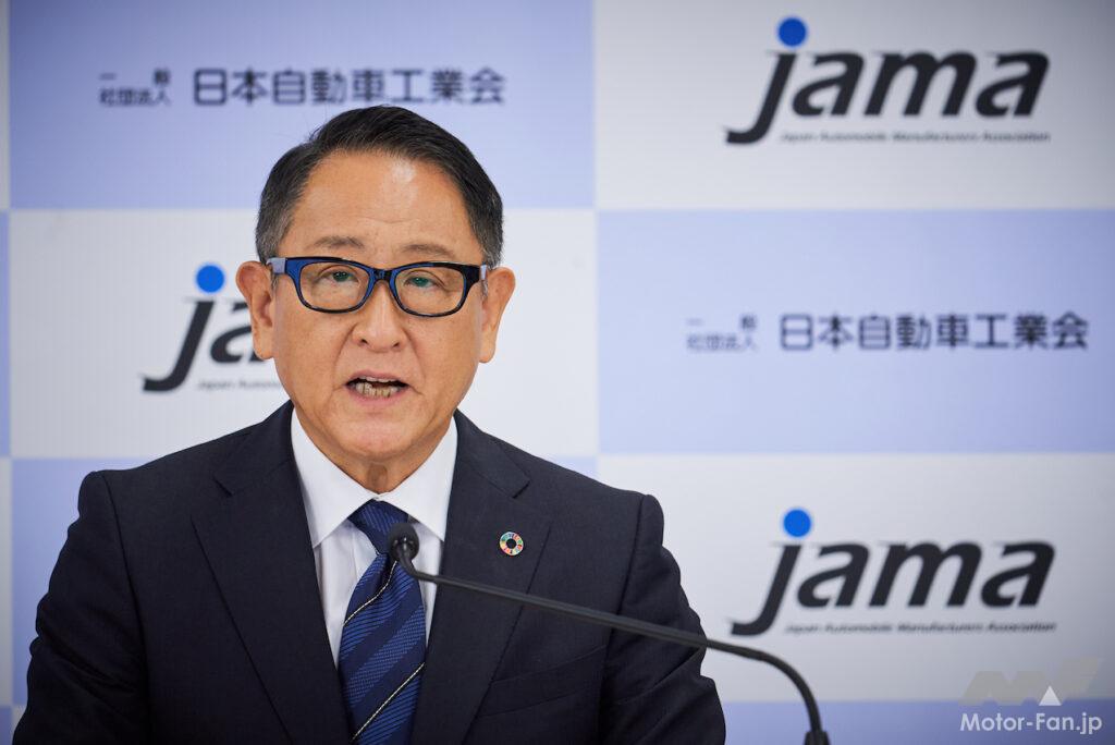 オンライン記者会見したのは、自工会会長の豊田章男氏、副会長の片山正則氏、鈴木俊宏氏、佐藤恒治氏、内田誠氏、三部敏宏氏、日髙祥博氏、永塚誠一氏の8名。それぞれ、トヨタ、いすゞ、スズキ、トヨタ、日産、ホンダ、ヤマハ発動機のトップである(永塚副会長は自工会常勤)。
