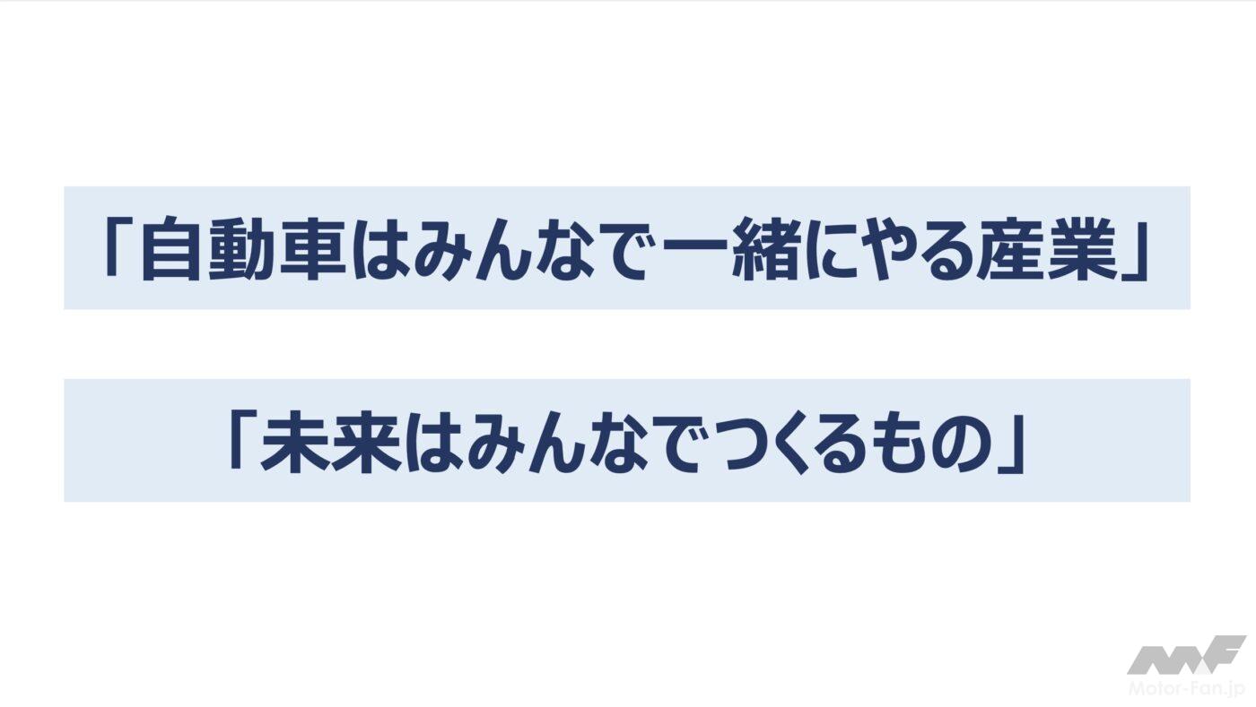 「自動車はみんなで一緒にやる産業」「未来はみんなでつくるもの」だと思います。日本の未来をより良いものにするためにメディアの皆様からもぜひ応援いただきますようよろしくお願い申し上げます。