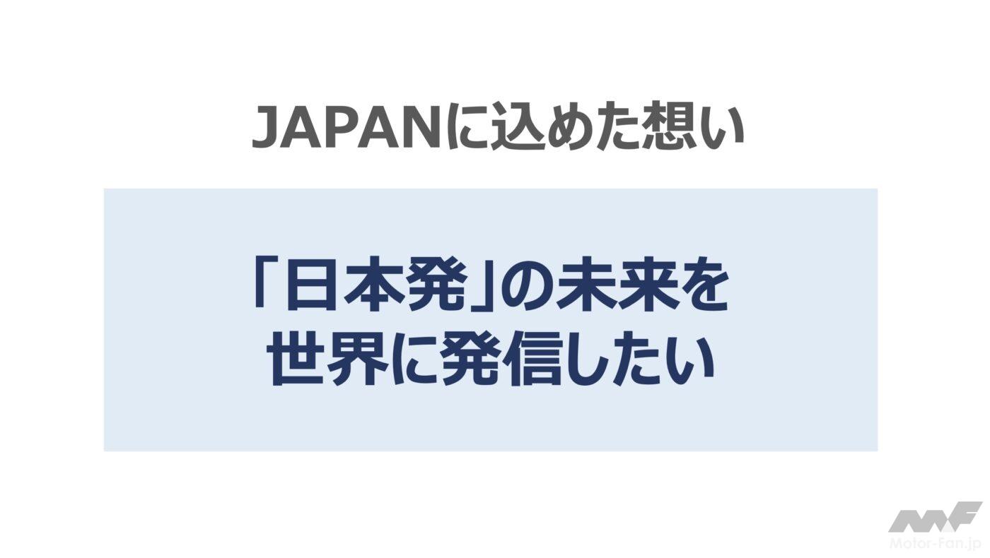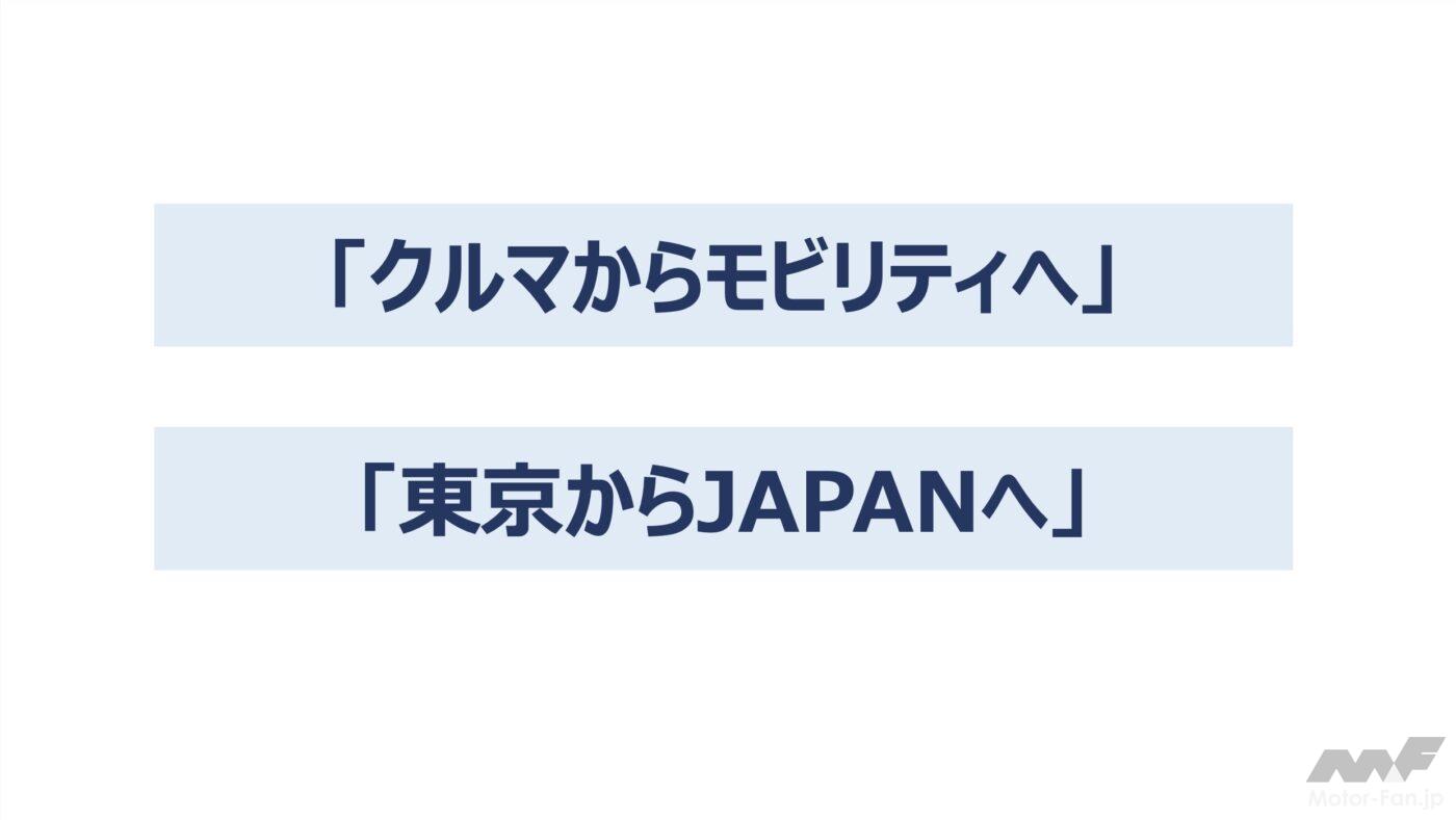 「私たち自動車産業で言えば、これまで当たり前だと思っていた「移動」が、実は、多くの人たちの働きによって支えられていることに気づくことができたと思います。そして、「クルマを走らせる550万人」が近づき、つながり、一つになって動き始めました。私たちの暮らしで言えば、皆が新しいコミュニケーション手段を求めた結果、オンラインミーティングやフードデリバリーなど、つながるための新しい技術・サービスが大きく進化いたしました。コロナ危機を乗り越えた今、「東京モーターショー改革」をさらに一歩、前に進めるという決意を込めて、本年から「ジャパンモビリティショー」に進化させてまいります。「クルマからモビリティへ」「東京からジャパンへ」特に「ジャパン」。日本には、素晴らしい技術がたくさんあります。未来をつくるために日々挑戦を続けておられる経営者もたくさんおられます。そんな人や技術が集まり、つながる場所をつくりたい。「日本発」の未来を世界に発信したい。そんな想いを「ジャパン」という言葉に込めました」