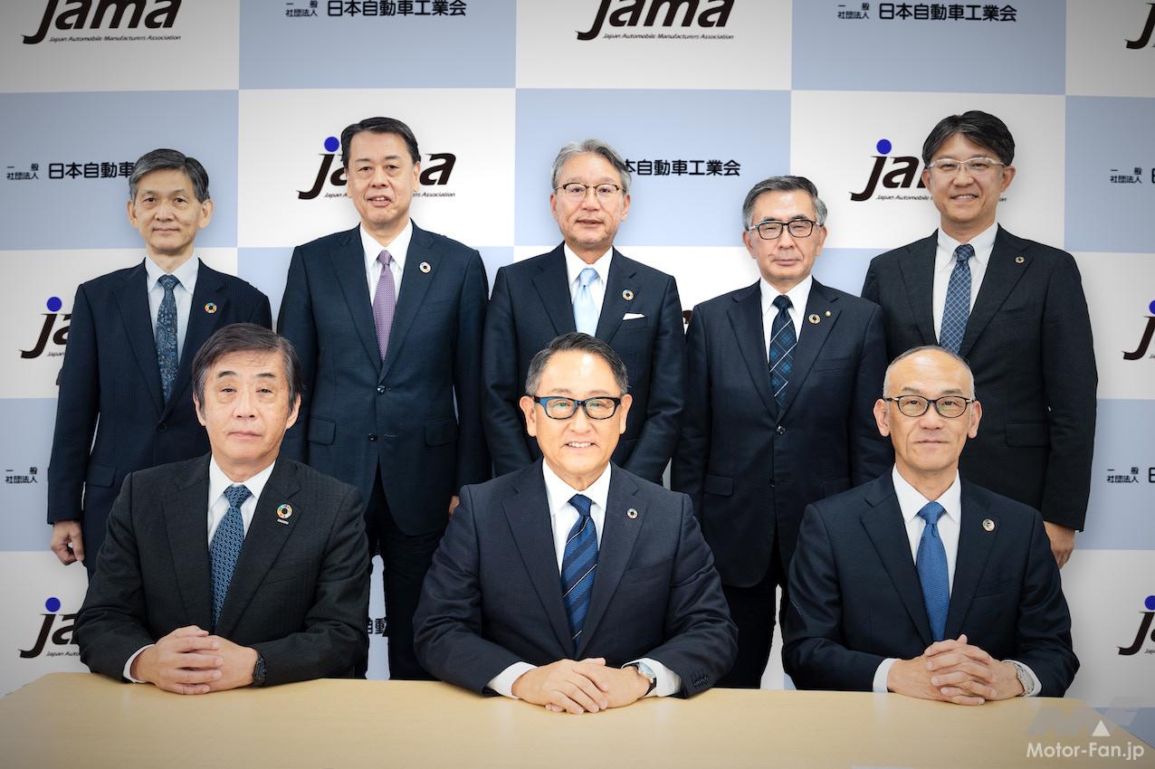 オンライン記者会見したのは、自工会会長の豊田章男氏、副会長の片山正則氏、鈴木俊宏氏、佐藤恒治氏、内田誠氏、三部敏宏氏、日髙祥博氏、永塚誠一氏の8名。それぞれ、トヨタ、いすゞ、スズキ、トヨタ、日産、ホンダ、ヤマハ発動機のトップである(永塚副会長は自工会常勤)。