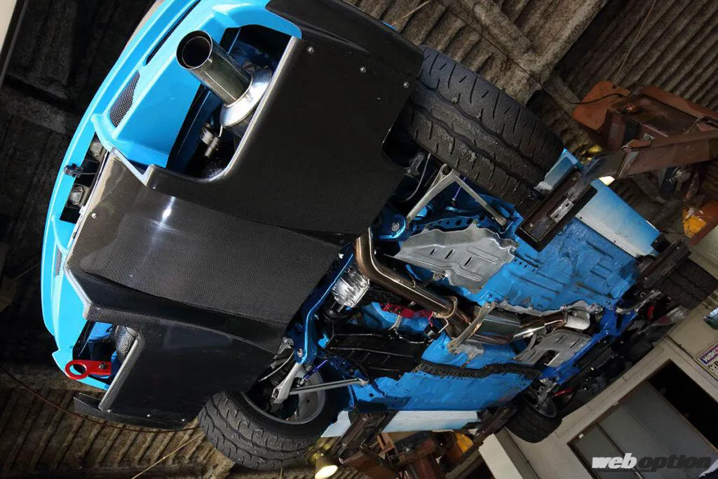 車体をリフトで上げると、フロア下まできっちり仕上げられていることが分かる。エアポンプレス化に伴い、触媒はSDコンバーターに変更。エキゾーストマフラーはRE雨宮謹製のドルフィンTAレプリカだ。