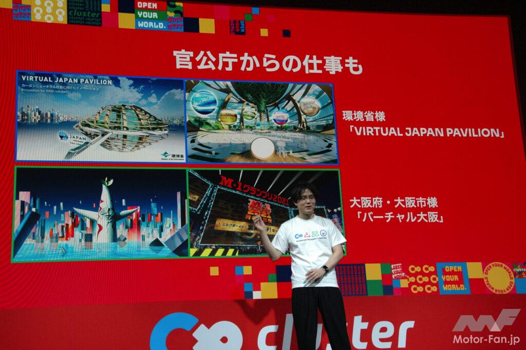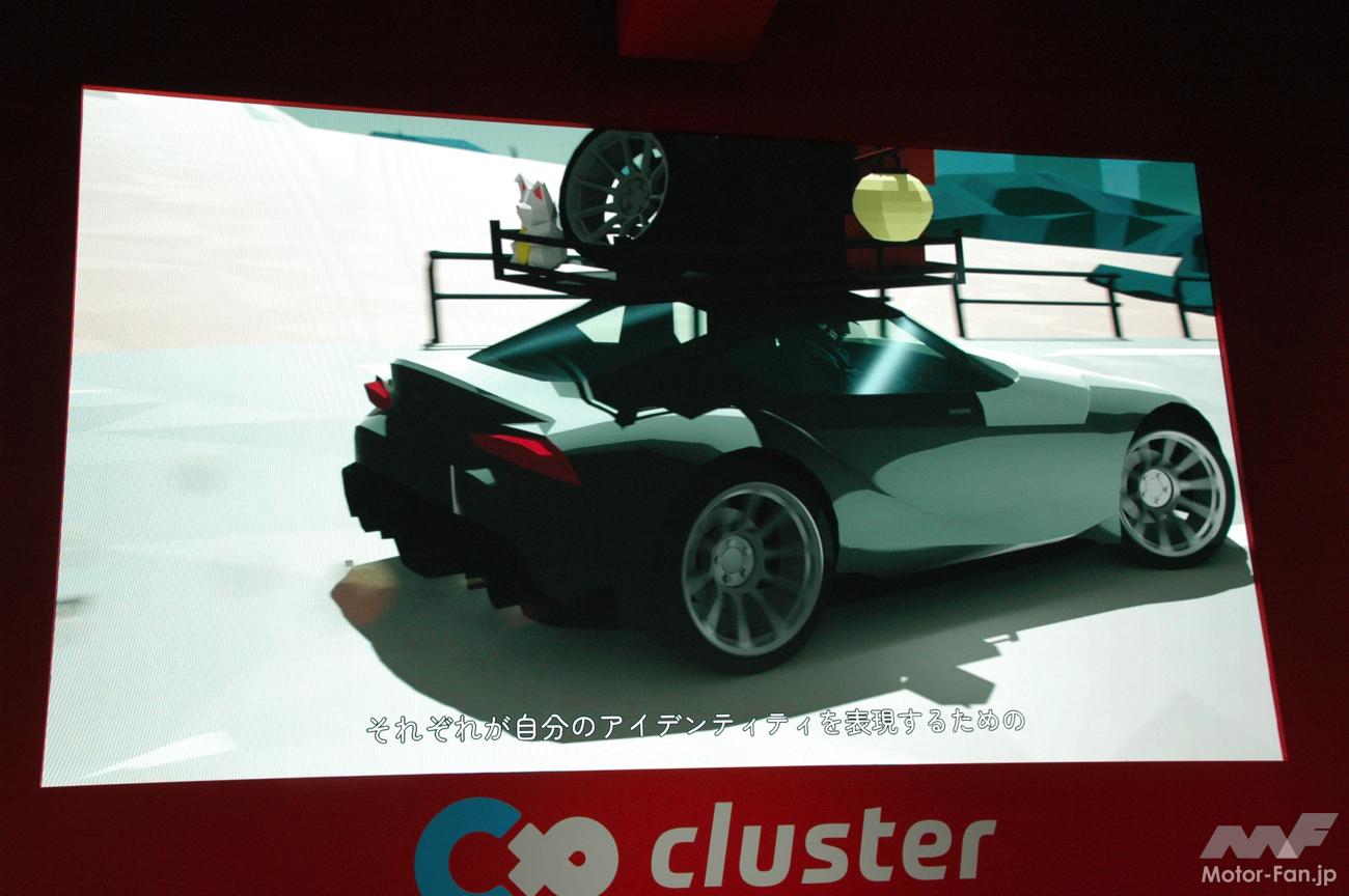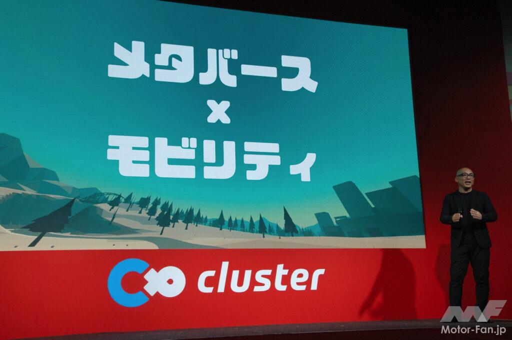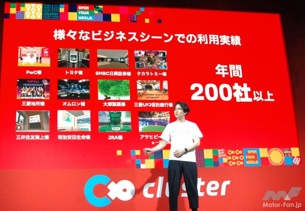 『cluster』はイベント累計動員数2000万人を誇る国内最大級のメタバースプラットフォームで、年間200社以上がさまざまなビジネスシーンで利用している。ちなみに、2023年1月に開催された「東京オートサロン2023」の『GR/レクサスバーチャルガレージ』はこのclusterを使用したものだ。