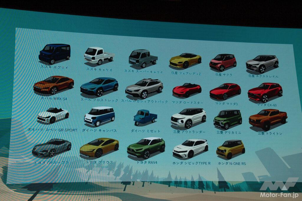 ■登場車種リスト スズキ:エブリイ、キャリイ、スーパーキャリイ スバル:WRX S4、クロストレック、アウトバック ダイハツ:コペンGR SPORT、キャンバス、ミゼット トヨタ:GRスープラ、プリウス、RAV4 日産:フェアレディZ、サクラ、エクストレイル マツダ:ロードスター、3、CX-60 三菱:アウトランダー、デリカミニ、トライトン ホンダ:シビックTYPE-R、N-ONE RS