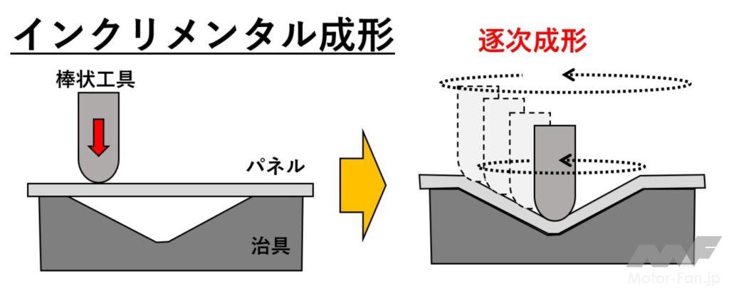 そのキー技術がインクリメンタル成形である。インクリメンタルは「徐々に」とか「逐次」といった意味を持つ。まず、突起のないプレーンな形状のバンパーを樹脂で成形し、追加工によってカナードを成形する。その追加工がインクリメンタル成形(逐次成形)。棒状の工具を連続的に押し付けて成形する工法で、鉄などの金属に適用するのが一般的なこの工法を樹脂に適用すべく開発に取り組んだ。