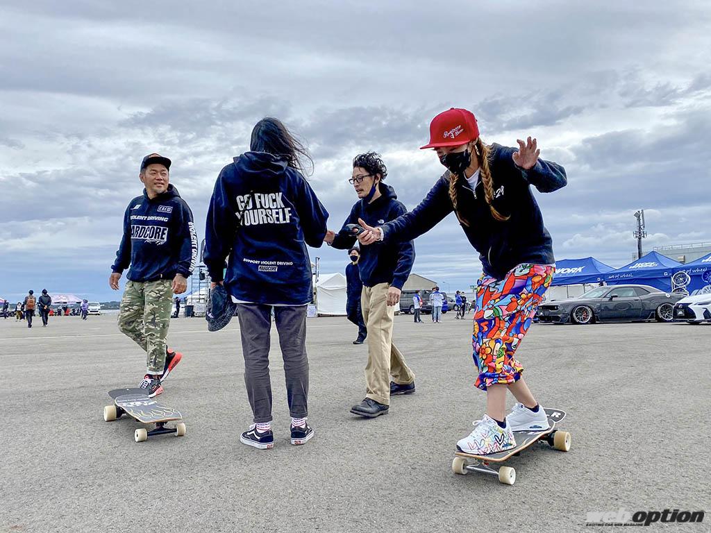 そして今回、TRA京都から新商品が登場! エアロパーツでもホイールでもなく…スケボーです(笑) モーターが付いていてリモコン操作で約30キロでの走行が可能な、いわゆるE-スケートボードです。開場前にブースの皆さんと試乗したのですが難しい! そもそも、私はスケボーに乗れないので最後までまともに立てませんでした…。
