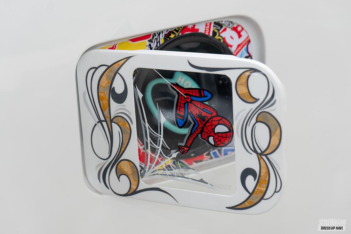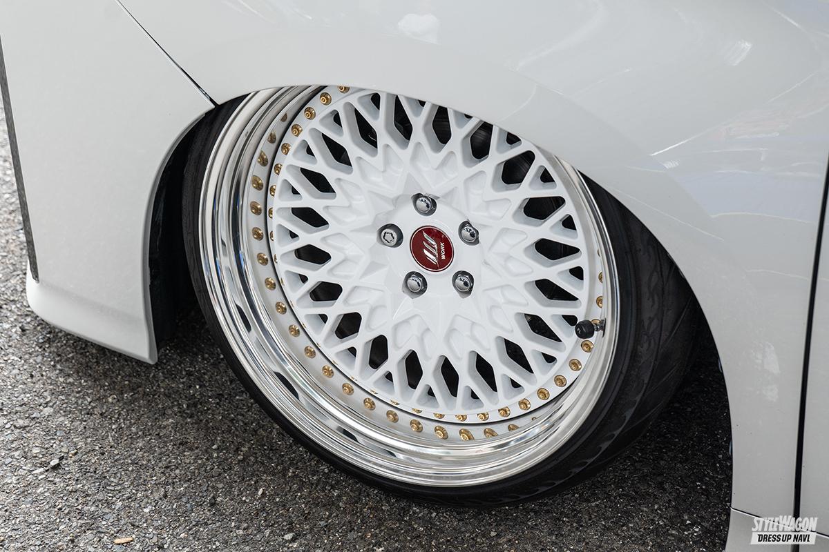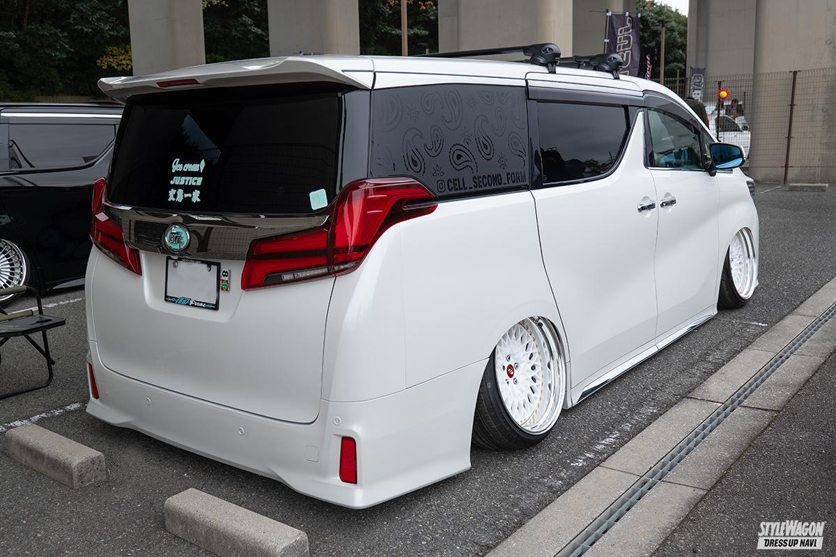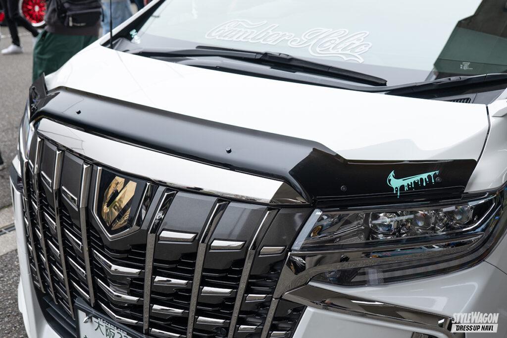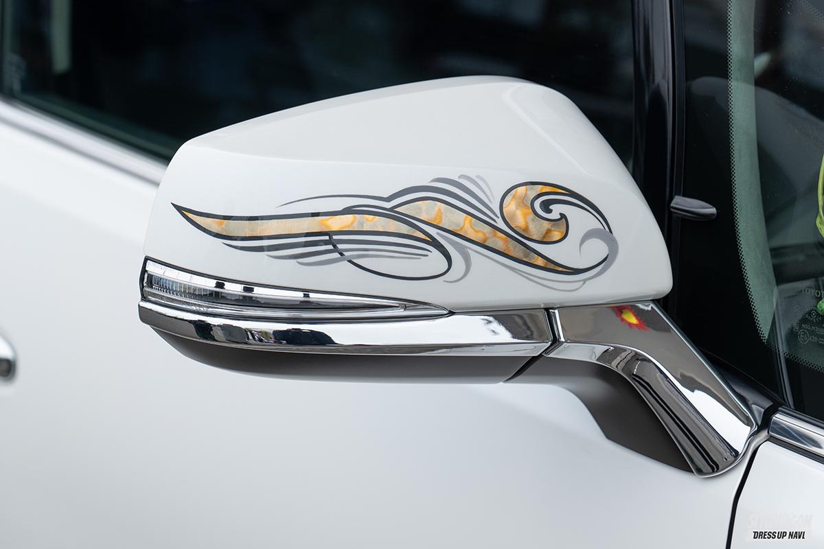 ベースは30アルファード前期だが、長年乗り続けているため飽きもきて。ならば乗り換え感覚で、と30後期顔へのフェイスチェンジをDIYで実現してしまったというセルさん。そんな彼が目指しているのは、アルファードであまりいない仮想USDM仕様だ。バグガードやルーフキャリアなどの定番はもちろん、金箔を使ったピンストライプを施したドアミラーや、オネストのガラスリッドにもスパイダーマンを描くなど、遊び心も取り入れたUSテイストを随所に投入。リアクォーターガラスにワンオフのペイズリー柄ステッカーを貼り付けるなど、独創的なアレンジも好印象。このスタイルだからこそ、USムード全開なワーク・グランシーカーが映えまくり!