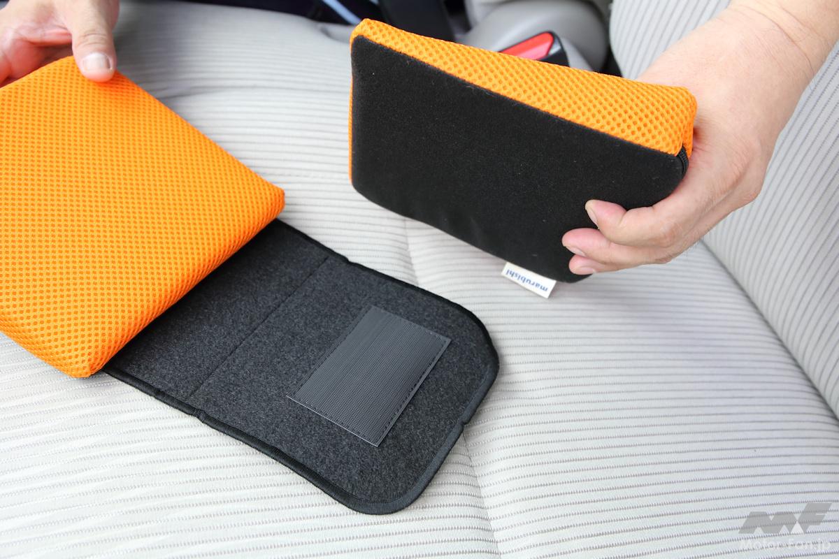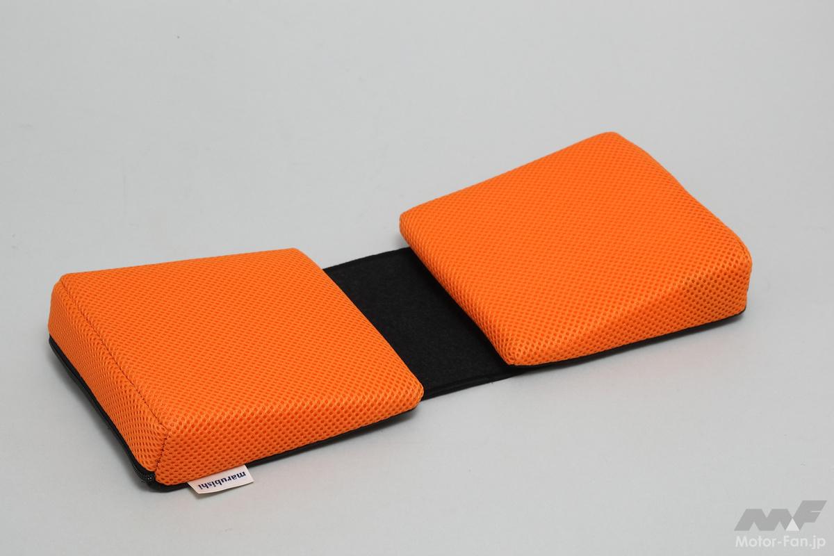 実際にクルマのシートに設置してみた。まずはくさびの頂点を左右それぞれ外側に向けて座面にセット。お尻が安定して体重も効果的に分散されているようだ。また、マジックテープの裏側がディンプル加工されており、滑りにくくなっている点もポイント。ただし本革シートなどには跡が付きそうなので注意が必要かも。さらにクッションの配置を変え、くさびの両方を上に向けて腰にセットすれば、ランバーサポートに早変わり。長距離運転で抜群の効果を発揮しそうだ。