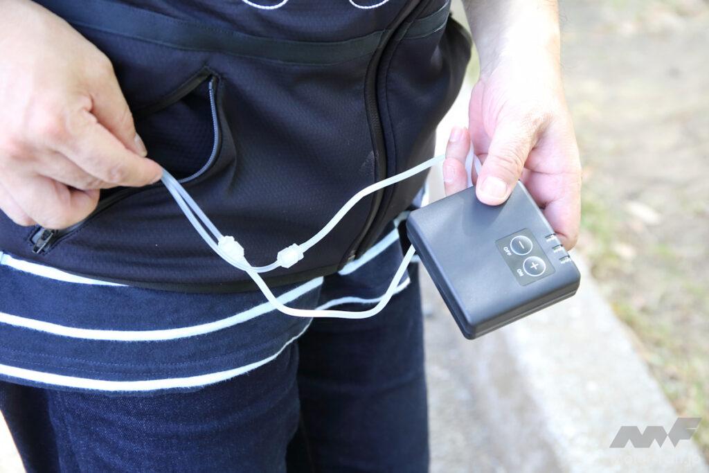 右のポケットに収納する付属のポンプコントローラーは単3形乾電池2本(充電池も使用可能)で駆動。ファン式に比べて省電力で、音が静かな点もメリットといえよう。水を入れるパウチパックの容量は約200mlで、こちらは左ポケットに収納。ちなみに水は目詰まり防止のため、必ず塩素が含まれた水道水を使用すること。送り出す水の量は6段階に切り替えられるが、多くても少なすぎても効果が薄れるため、真ん中の3段階目で開始し、調節する。素肌に着るのがもっとも効果的だが、水はベストの外側から気化するので、インナーウェアの上に着ても十分な気化熱効果が得られる。