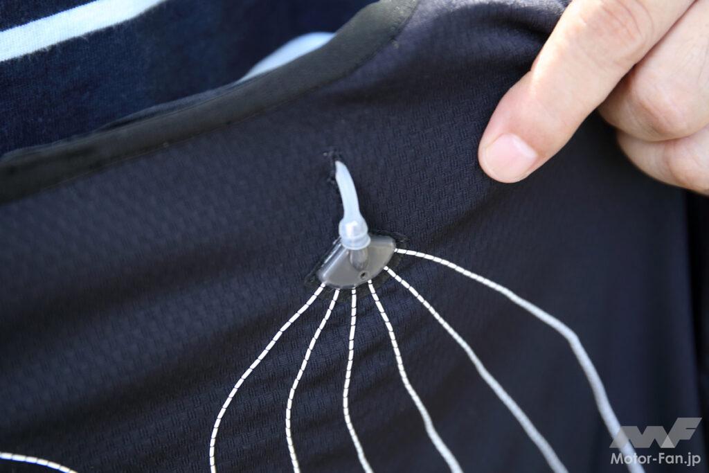 この水冷ベストの仕組みを簡単に説明すると、パウチ内の水をポンプコントローラーで少しずつ送り込み、気化熱を発生させるというもの。水そのもので冷やすのではなく気化熱を利用するので、使用する水は常温でOK。またファン付きウエアとは異なり、スイッチを入れればすぐ涼しくなるわけではなく、ジワジワと涼しくなるという感じだ。肌面には濡れにくい特殊生地を採用し、ドライで快適な着心地感を実現している。