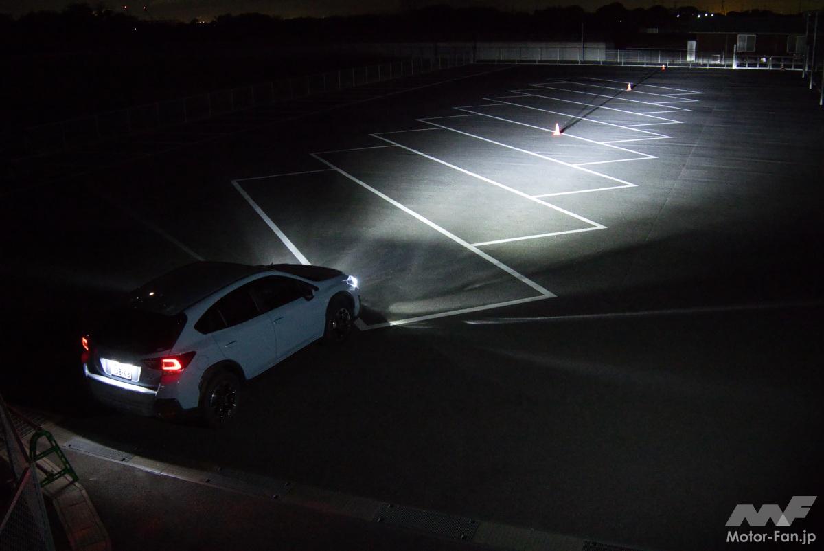 灯具に入れた状態での明るさ(「FOM」と呼ばれる)にもこだわり、理想の配光、照射を追求するなど、LEDヘッドライトに求められる要件を高次元でバランスさせたという。その実力をチェックするべく、インプレッサスポーツ(純正ハロゲン車)を使用して比較したところ、圧倒的な差が確認できた。