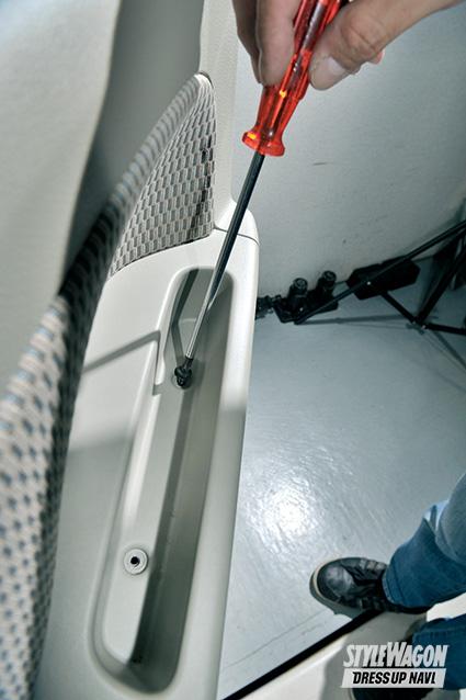 手順1 ドア内張りは、表側から確認できる留め具はネジがわずか3つと非常に少ない。ほとんどは内張り内に手を差し込んでの作業だ。まずはドアポケット内にあるふたつのネジを外す。深さがあるので先端の長いドライバーが必要。