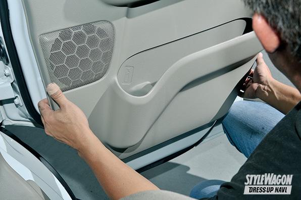 FINISH ドア内張りが外れて、骨組みやスピーカーが丸見えに。オーディオが好きな人にとってはスピーカーの交換や、防水シートを外してデッドニングするなどネタの宝庫。