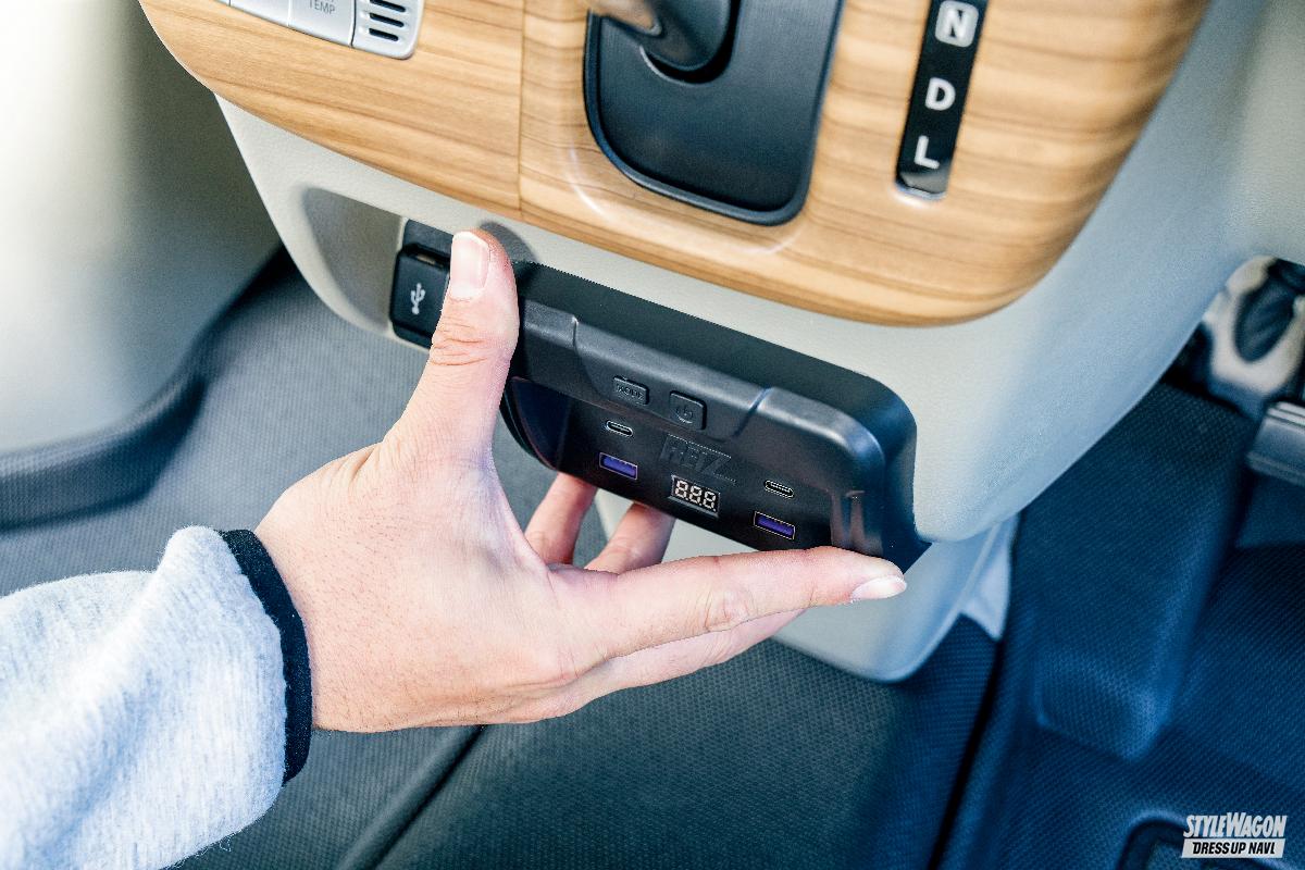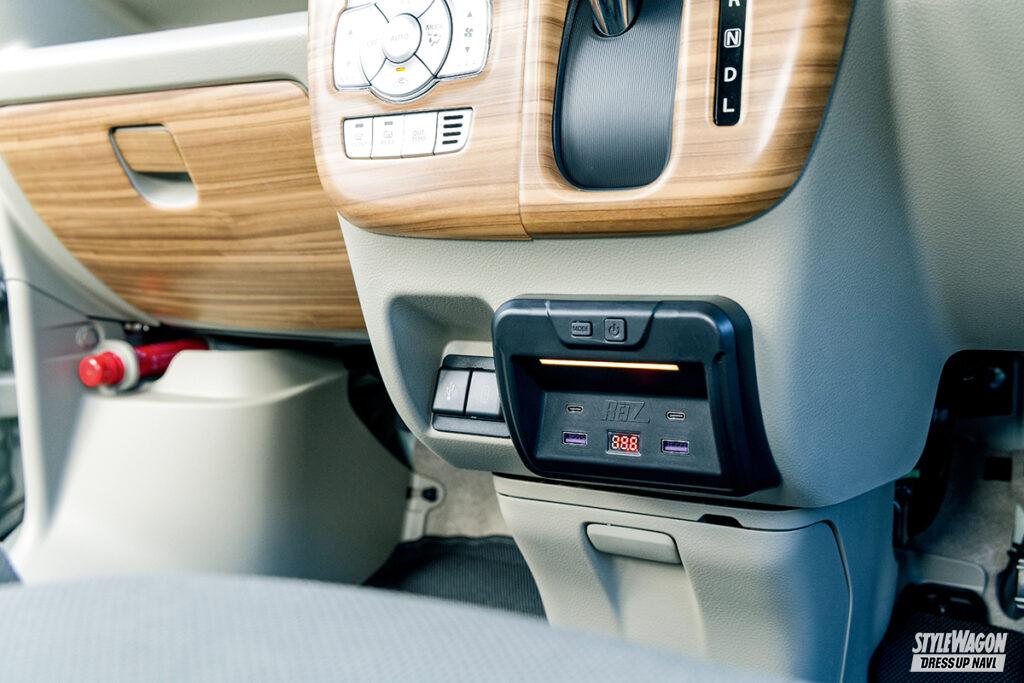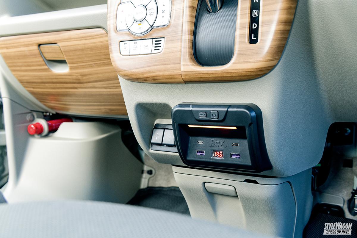 純正カードケース(灰皿)を取り外した後に装着できるUSB電源キット。急速充電(クイックチャージ3.0規格)対応のUSB Type-A×2とType-C×2を装備。本体下部には足もとをホワイト光で照らすフットランプを搭載。前面には色切り替え式(9色)のカラーイルミネーションとデジタル電圧計も備えている。装着は差し込んで両面テープで固定するだけ。純正装備のような違和感のない見た目と、今や必須装備ともいえるUSB電源が手に入る。