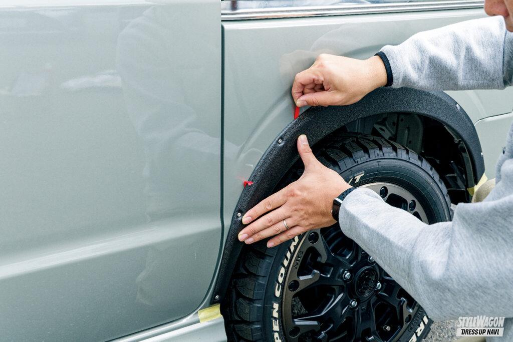 アゲ系&オフロード系はもとより、スポーティなローダウン仕様でもフィットする片側9㎜幅のオーバーフェンダー。製品はABSの素地仕上げなのでザラザラした仕上がり。本体にはタフな印象をアップさせるダミーボルト付き。フェンダーのアーチラインはノーマルフェンダーよりも約20㎜ダウンとなるアーチダウンデザインだが、アゲ系でも問題なく装着できる。装着は付属の両面テープでボディに固定するだけなので、初心者でもOKだ。