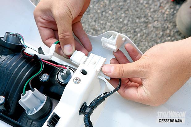 手順1 ボディと固定するクリップやツメを外してリアバンパーを取り外したら、純正のテールランプから伸びるカプラーを引き抜こう。工具などは必要なく、手で引き抜ける。