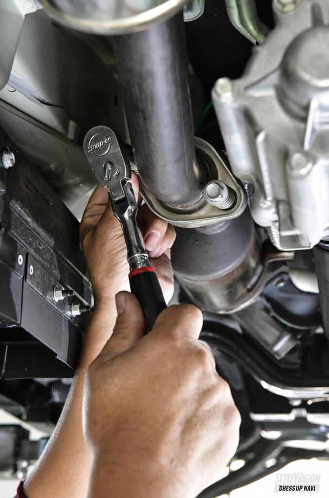 社外マフラーに交換することで排気効率やビジュアルの向上、そして純正にはない上質なサウンドが得られるなどそのメリットは大きい。しかし年式が新しい現行エブリイは、法改正の兼ね合いでマフラー交換のハードルが高くなっている。しかしシュピーゲルのレベルサウンド304は車検に通る条件となる加速騒音試験をクリアした、JQR認証を取得済み。だから車検も問題ないし、安心してマフラーを交換できる。純正マフラーは中間からリアまで1本モノなので、交換する時はできればリフトに上げて十分なクリアランスを確保した方が取り外しやすい。また年数が経っているクルマはボルトが固着していることがあるため、事前に潤滑剤をたっぷり吹いておこう。