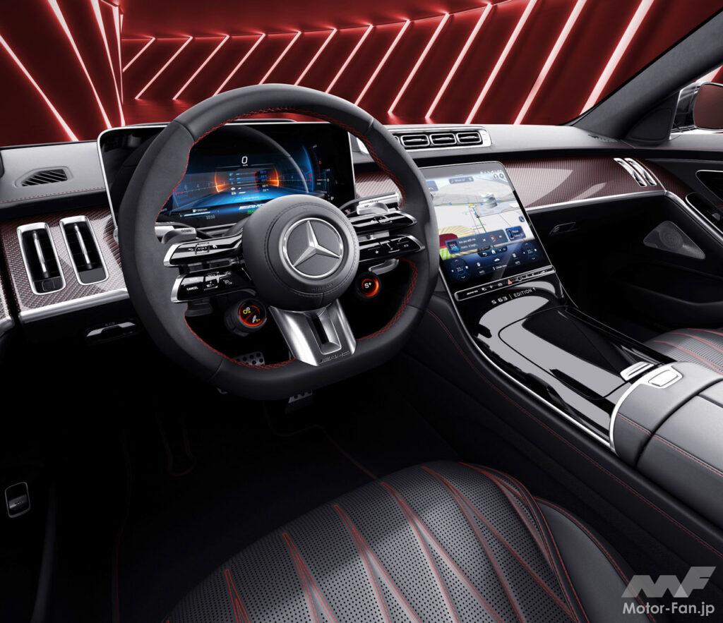 このたび発表された「S 63 E パフォーマンス・エディション1」のボディカラーは、MANUFAKTUR アルペングレー(ソリッド)で、随所にブラックアクセントが施されている。足元は、21インチAMGクロススポークアルミホイール(鍛造)、レッドペイントブレーキキャリパーの採用により、引き締まったエクステリアを実現。給油口にはAMGロゴ入りフューエルフィラーキャップ(シルバークローム)、Edition1ロゴ入りインドアカーカバーも標準装備され、特別感が演出されている。