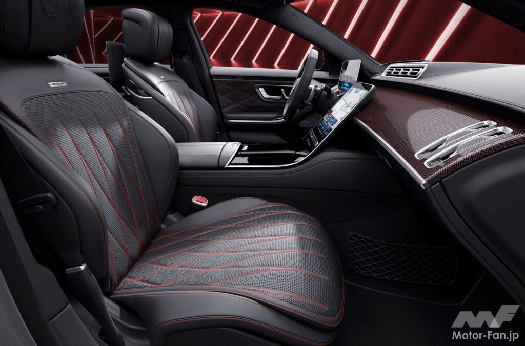 インテリアは、Sクラスらしい高い質感をそのままに、AMG固有の機能を組み合わせている。特別な装飾として、AMGパフォーマンスステアリング(ナッパレザー)、AMGドライブコントロールスイッチ、 AMGスポーツペダル、AMGロゴ入りイルミネーテッドステップカバーを採用し、 AMG専用ダイヤモンドステッチのシートに加え、 AMGバッジ付き前席バックレスト、ヘッドレストにエンボス加工された AMGロゴを採用。ドライビングに集中しながら各種メニュー操作が可能な AMG ドライブコントロールスイッチを備えた「AMGパフォーマンスステアリングホイール」を標準装備した点も特色に挙げられる。
