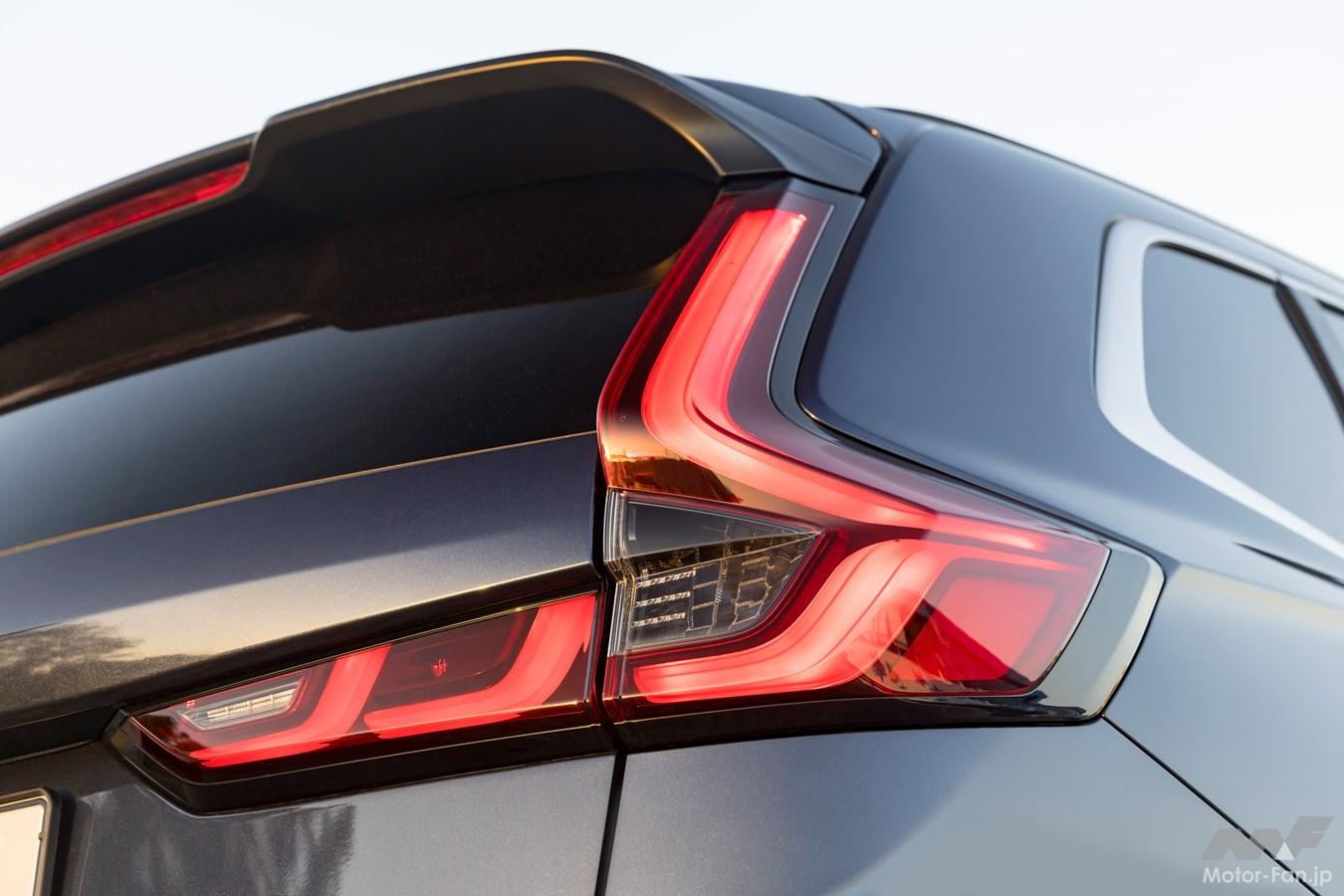 先代モデルより10mmワイドに、80mmロングになった最新のCR-Vのシルエットは、より洗練されたスポーティなSUVへと成熟した。フットプリントを拡大したことで、Aピラーをより後方に配置し、ボンネットを細長くすることで、よりダイナミックな外観が実現されている。大胆な水平ラインと40mm延長されたホイールベースも相まって、CR-Vでありながら現代的なアレンジが加えられている。
