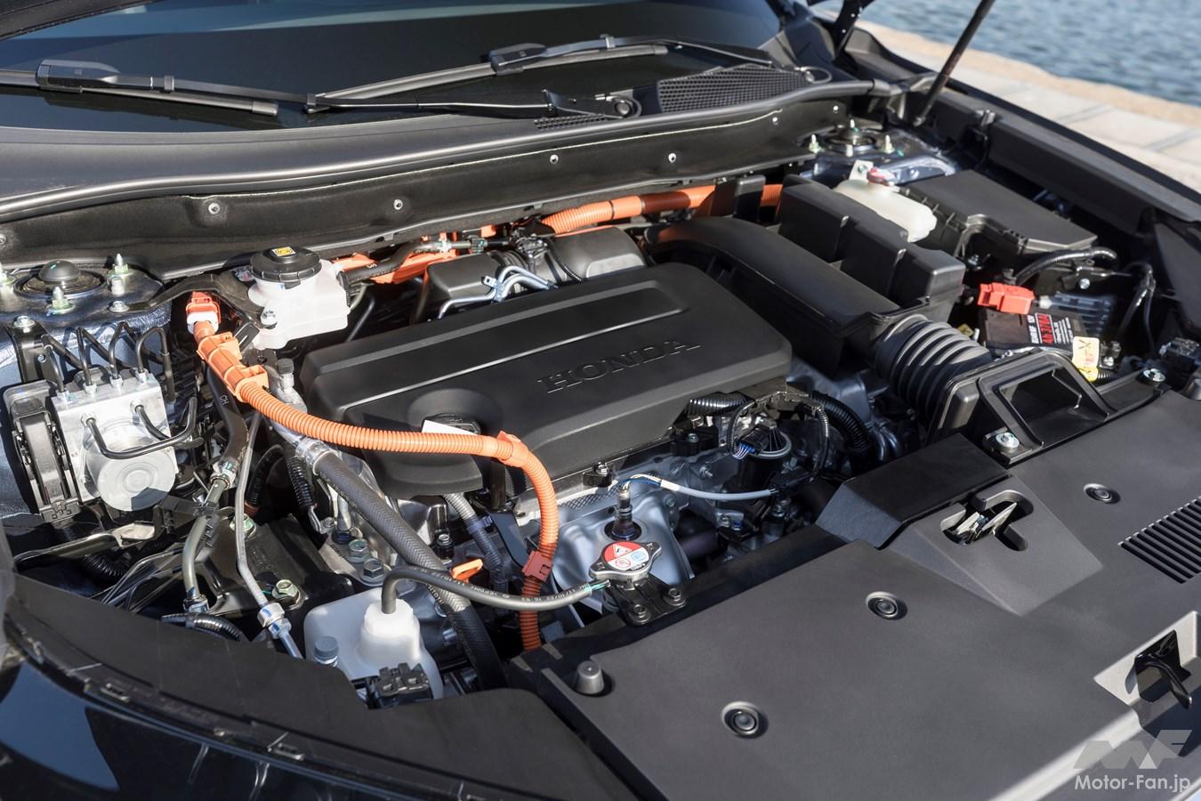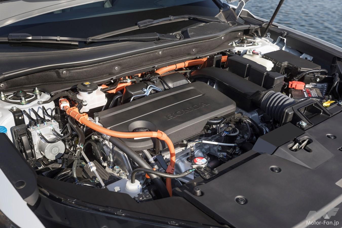 新型CR-Vのe:HEVモデルは、評価の高いフルハイブリッドパワートレインの最新版を搭載し、ガソリンエンジンと新開発の軽量デュアル電気モーター式オートマチックトランスミッションがシームレスに組み合わされている。この最新モデルでは、推進モーターとジェネレーターを別軸に配置することで、設計スペースを増やすことなく、トルクは6.5%アップの335Nmが実現された。また、モーターの最高回転数も1,500rpmアップの14,500rpmとなり、最高速度が7%向上した。