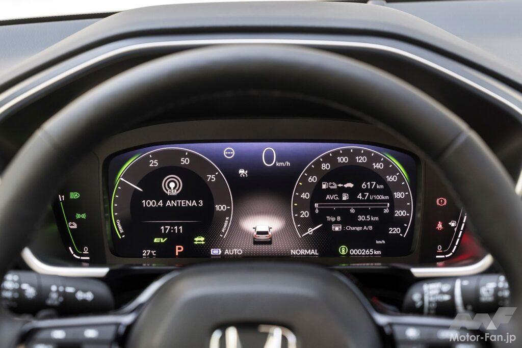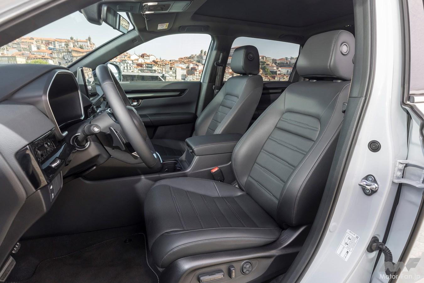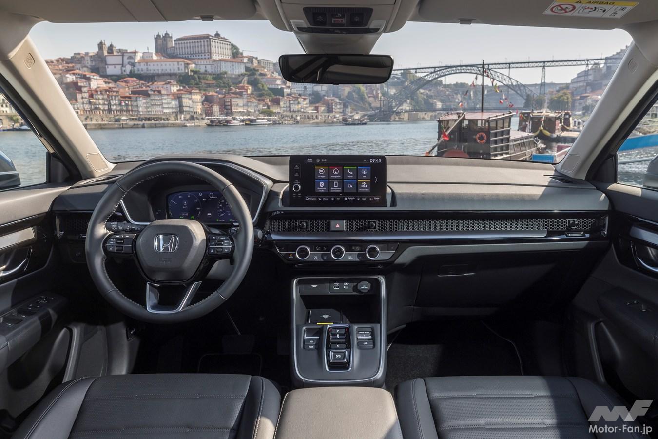 新型CR-Vのキャビンには、より上質な質感の素材を随所に採用し、分かりやすく操作しやすい触感のスイッチや操作系を採用することで、プレミアムセグメントSUVにふさわしいラグジュアリーな車内空間に仕上げられている。フロントは、すっきりとした低めのダッシュボードで、フルワイドのエアベント、中央に設置された9.0インチのインフォテインメント・スクリーン、ステアリング・ホイールの後ろに設置された10.2インチの大型デジタル・ダイヤルを備え、これらすべてが外からの視認性をさらに高めるように配置されている。e:PHEVとe:HEVとでは、それぞれ異なるスタイリングが採用されており、e:PHEVには、吹き出し口を含むセンターダッシュ全体に専用のメタルハニカムパターンが施され、よりプレミアムでスポーティな仕上がりになっている。