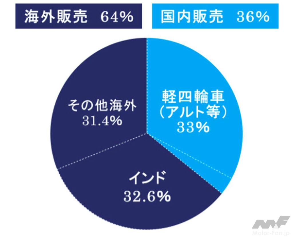 海外販売は、1959年に「スズライト」を輸出したことから始まった。1975年にはパキスタンでスズキの四輪車で初めて現地生産を開始し、1983年にはインド、1992年にはハンガリーなど、海外生産拠点の拡充も積極的に進めてきた。インドは、インド国内向けだけでなくアフリカ向けなど輸出向けの生産拠点としての役割も担っている。
