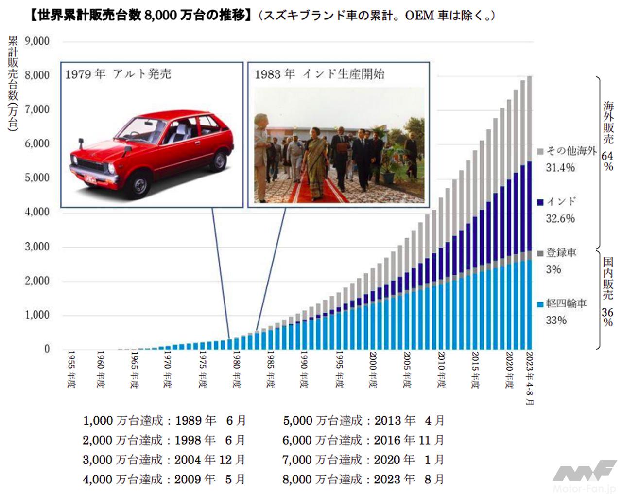 8000万台の中でも20%を占める「アルト」は1979年の発売以来、44年にわたり多くの方々に愛され、日本の軽四輪車を代表するモデルとなっている。日本の軽四輪車であった「アルト」は日本のみならず世界に広がり、特にインドでは販売台数に大きく貢献している。