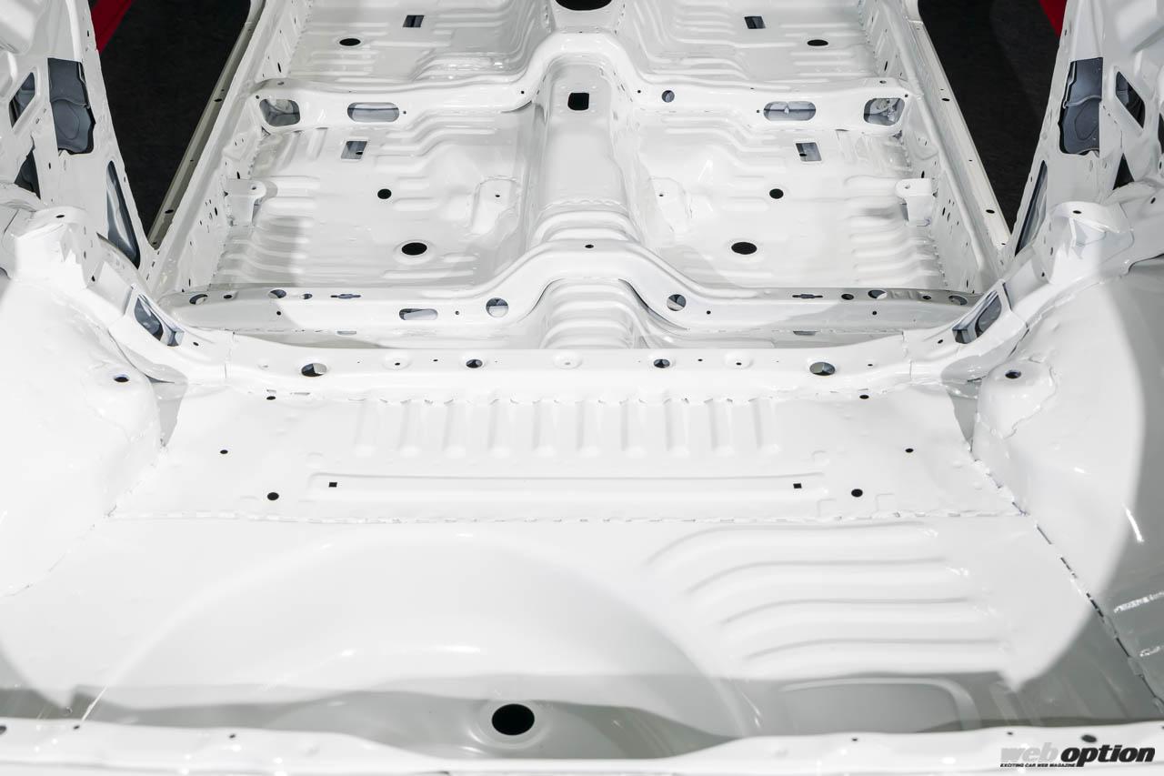 そこでボディ各部のスポット増しを行い、各車両の勘所には部分溶接も取り入れ、現代的な剛性感を実現。展示されたホワイトボディにも実際にスポット増しが行われており、ドアまわりのほか、インナーフェンダーなどにも施行。基本的には、もともとのスポット溶接跡の中間に打点を増やしていくので、簡単に言えば倍のスポット溶接数になるイメージだ。