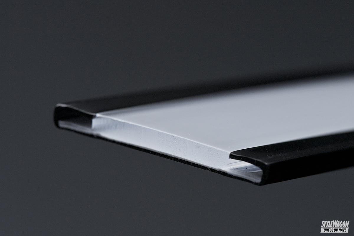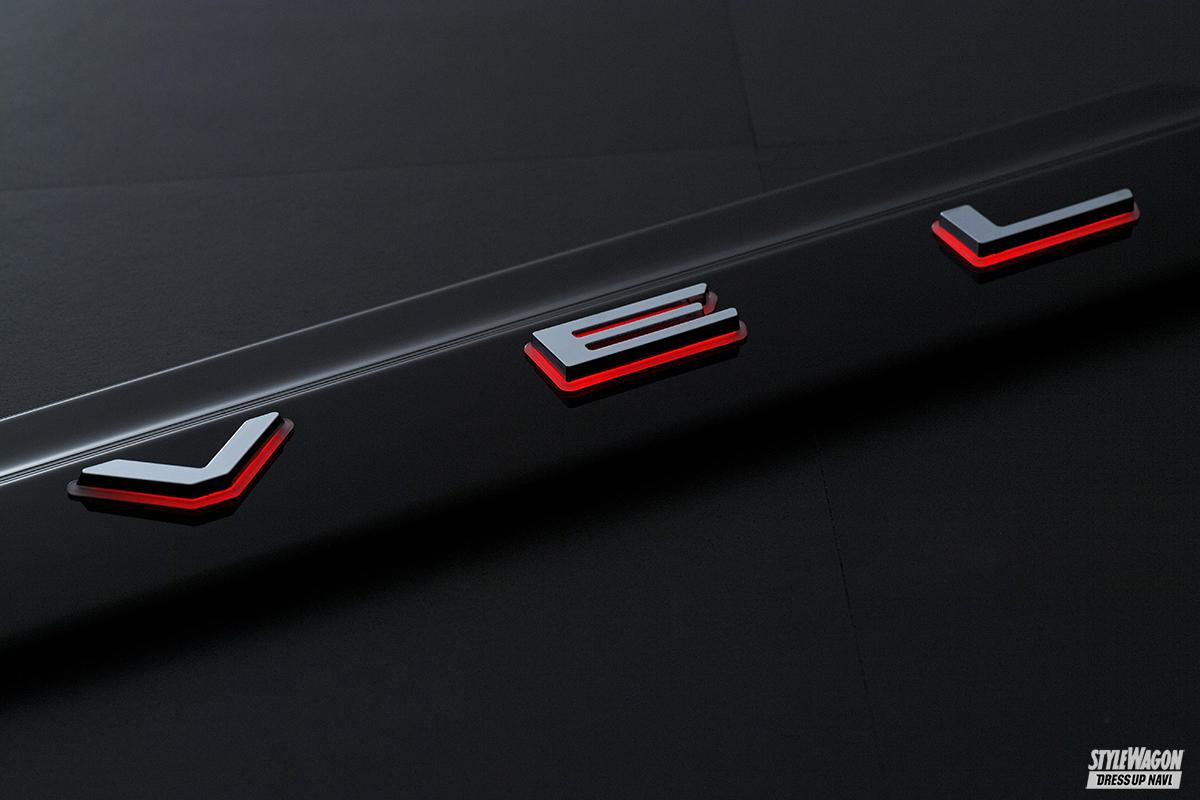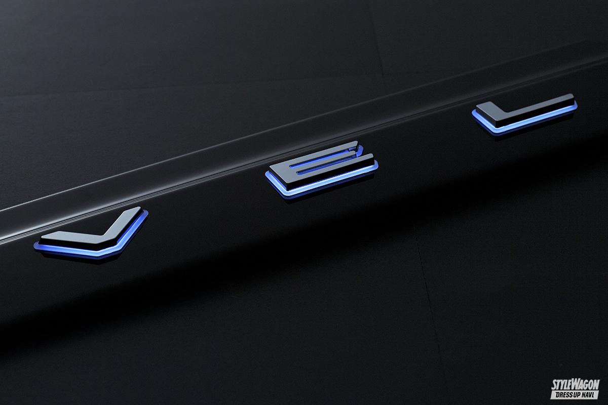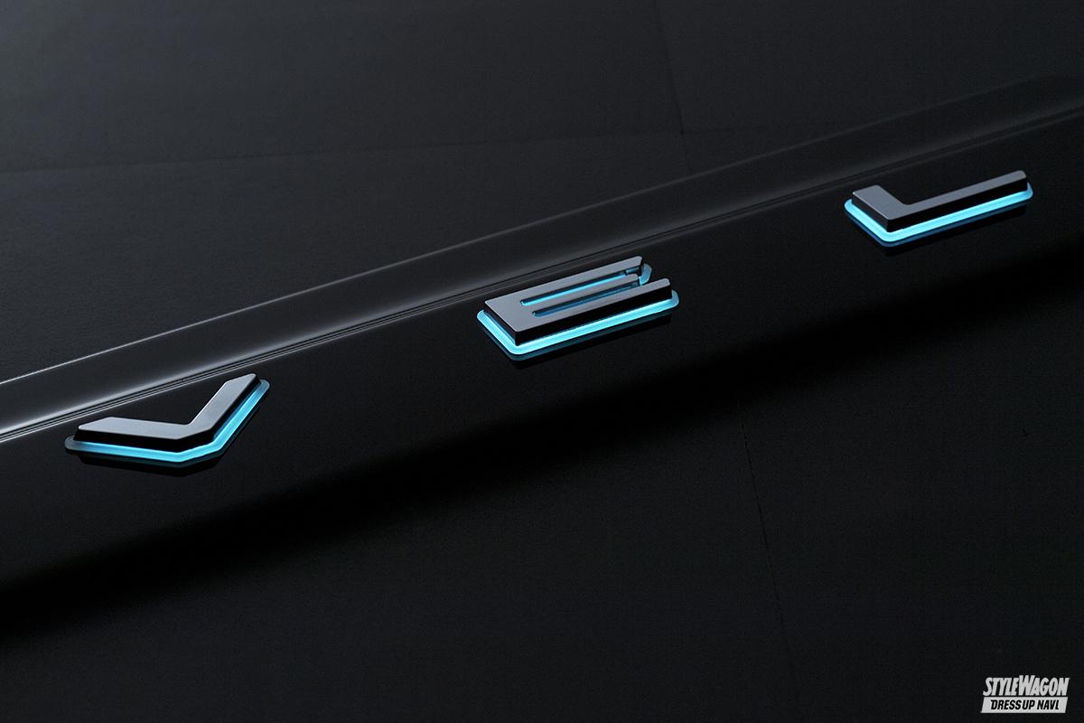 ガーニッシュはPPE素材を採用。高精度で違和感の無い仕上がりと、非点灯時の純正然とした佇まいに大きく貢献する。これに、アルファベット型レンズ、高輝度LED、発光モールがインストールされる。点灯すれば、明る過ぎない美しい光が、均一かつ自然に広がる優れモノ。すべて、自社工場で生産される日本製であることも付け加えておく。電源はテールランプから。装着に車両の加工は要らずリセール面でも有利だ。