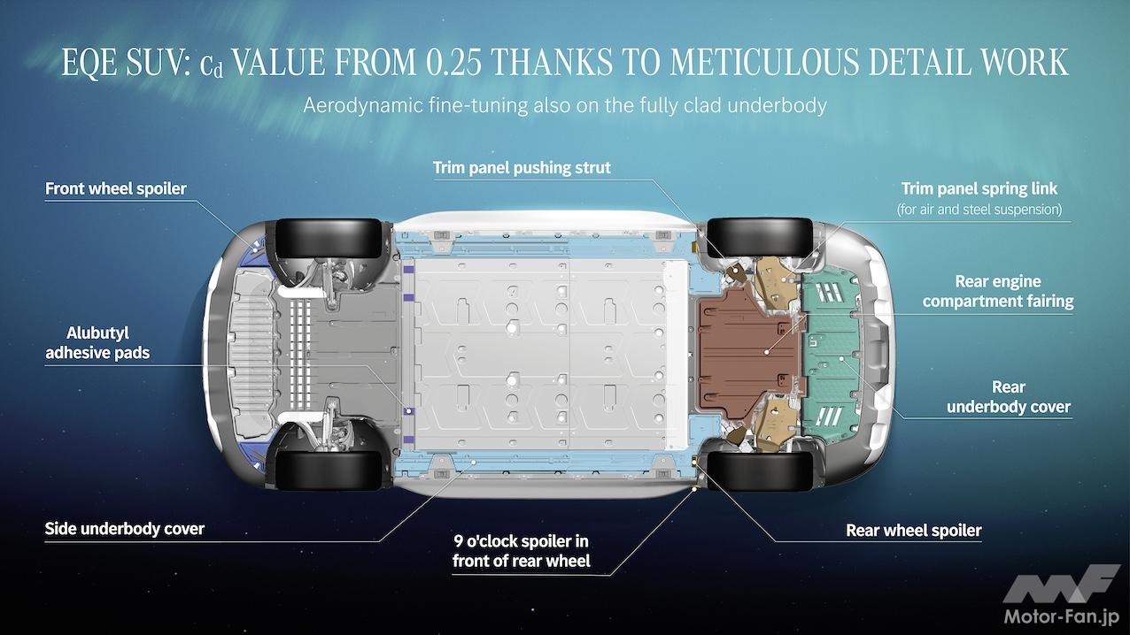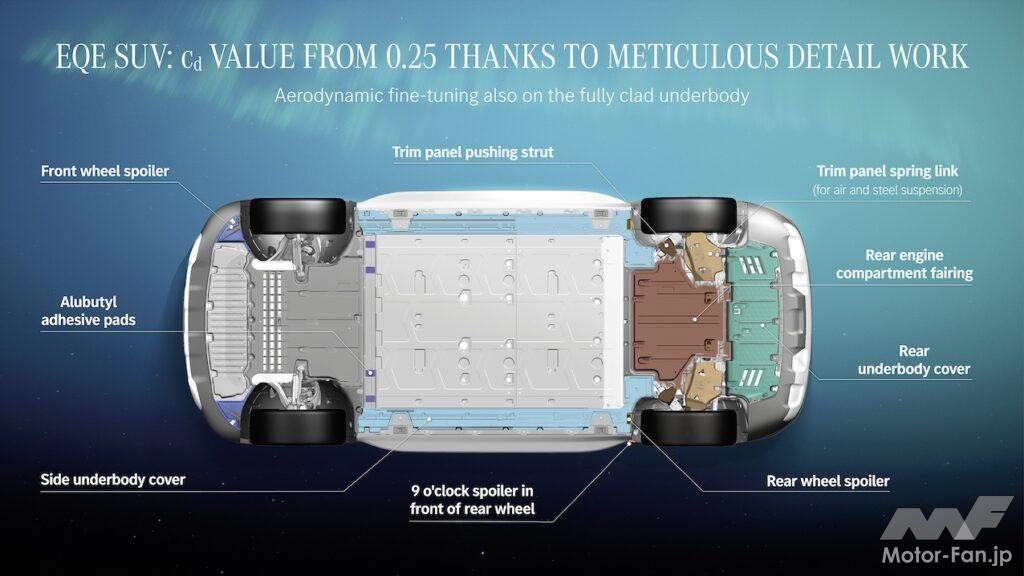 EQE SUVの大きな特徴は3つある。ひとつは空気抵抗の低減。EQS SUVだって気を使っていないわけではないが、床下を覗き込んでみると、半端ない気の使いようがわかる。機能上動いてしまうサスペンションまわりを除いてほぼフラットになっている。リヤのロワーリンクは空力を意識したフラットな形状だ。メルセデス・ベンツがフロントホイールスポイラーと呼んでいるフロントタイヤ前のストレーキは、単純な矩形ではなくノコギリの歯のようにギザギザになっている。このほうがドラッグ(空気抵抗)低減効果が高いのだろう。Cd値(空気抵抗係数)は0.25だ。