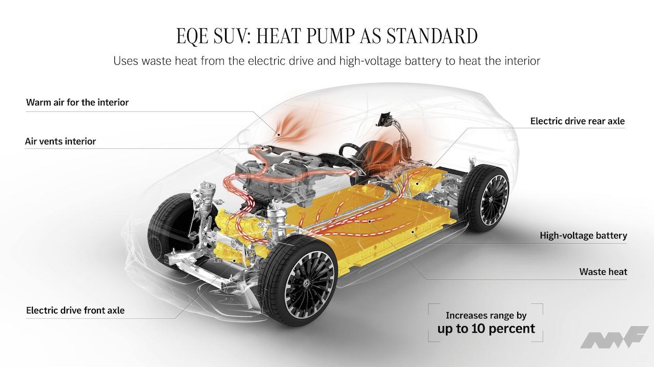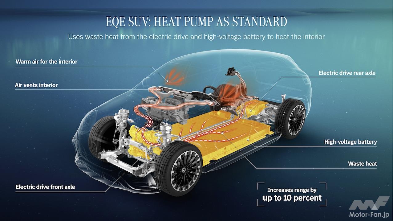 EQE SUVの大きな特徴の2つめはヒートポンプの採用だ。前後のモーターや高電圧バッテリー(リチウムイオンバッテリー)が運用中に発し、通常は捨てている熱を効率良く回収して車室内ヒーターの熱源にする仕組みである。このヒートポンプのおかげで航続距離が最大10%伸びるという。
