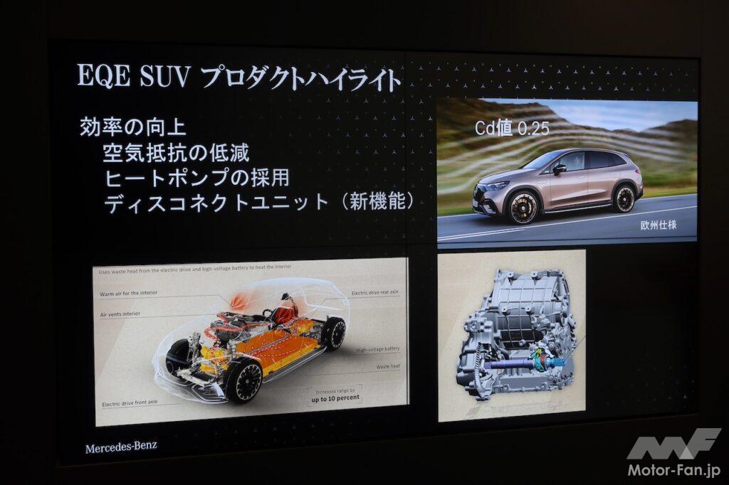 3つめの大きな特徴は、ディスコネクトユニット(DCU)の採用だ。発表のタイミングがそう変わらないEQS SUVには適用されておらず、EQE SUVに適用されたところに、BEVに関連する技術開発のスピードを感じる。いずれ、アップデートのタイミングでEQS SUVやセダン系BEVにも追加適用されることだろう。