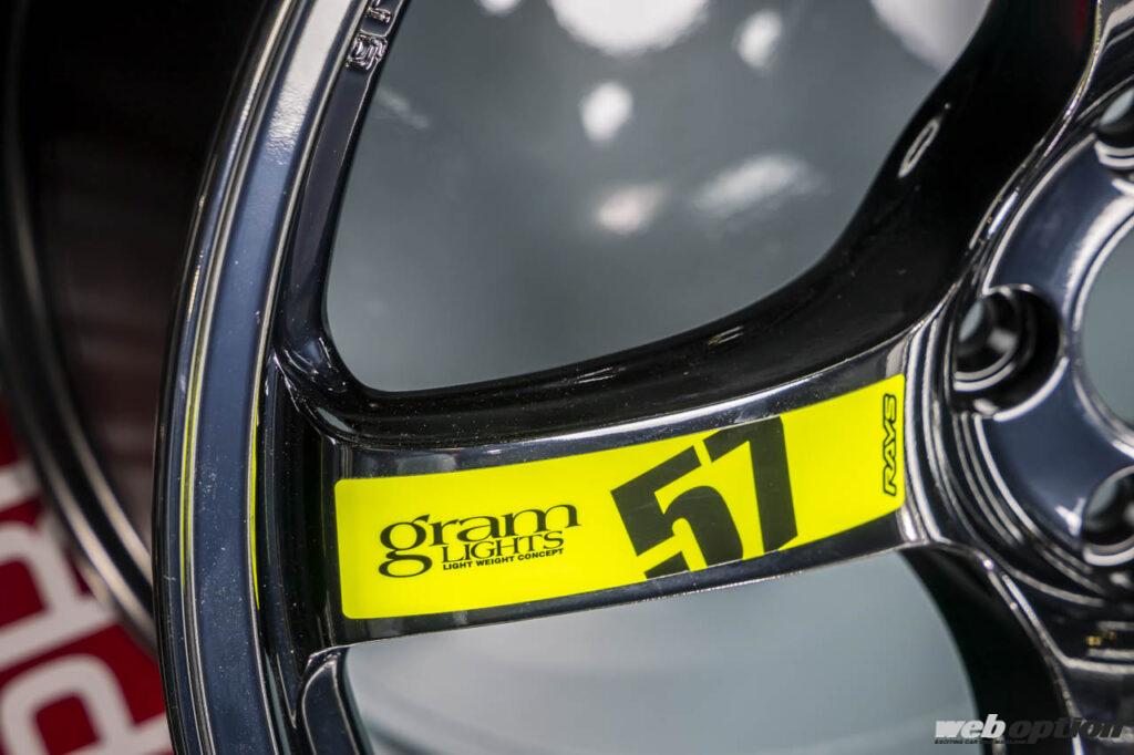 「57NR」には、主にコンパクトカー向けインチアップサイズをラインナップし、初めてホイール交換をするカスタマイズ初心者にも最適な「Spec M」を追加。カラーはグロッシーブラックで、ブルーのスポークステッカーを付属。リムのレイズロゴも同じブルーで彩られる。サイズは17インチと18インチ。