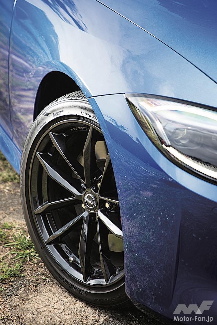 ワインディングロードで感心するるのが、サスペンションがしなやかなことだ。FRとしては限界に近いパワーを得ていて、なおかつショートホイールベース、さらに新型はフロントのトレッドおよびタイヤ幅を拡げて俊敏性を高めているのだから、さぞかしロールやピッチングを抑えた硬い足まわりなのかと思いきや、逆なのだ。これはストロークを活かしてタイヤを路面に押しつけていく特性にしようという意志の表れ。意外なほどボディは動くが、ストロークしていくほどに粘りが増していくので安心感がある。硬い足まわりだとグリップの限界を超えたときの動きが早くなるが、フェアレディZはコントローラブルなのだ。ダンスパートナーと呼ぶ意味が即座に理解できた。