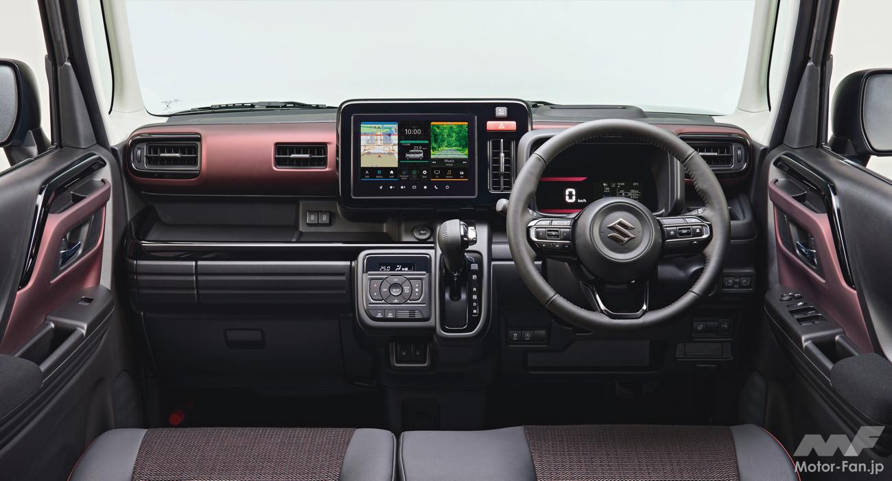 スペーシア/スペーシアカスタムのインテリアは時流に合わせてセンターのディスプレイを拡大しているが、基本的にはキープコンセプトのレイアウトとデザインにになっている。