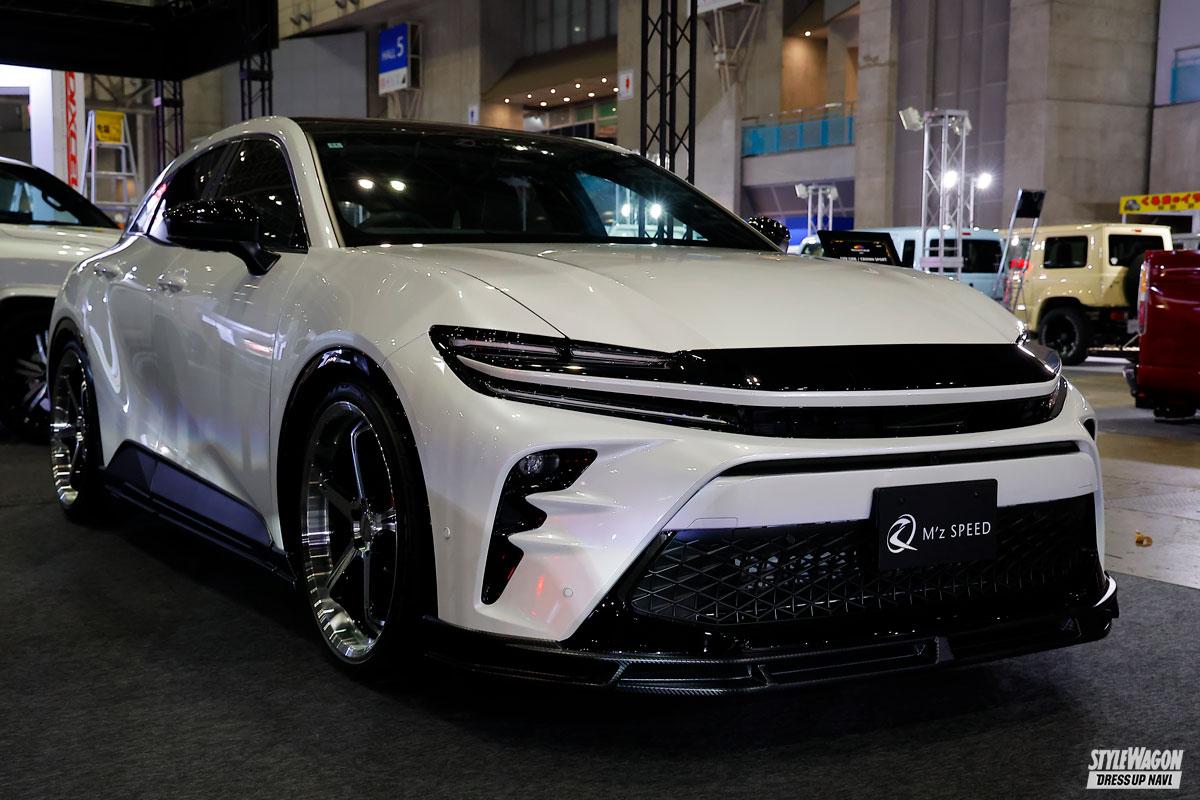 東京オートサロンで毎年様々な新製品をお披露目しているカスタムメーカーの「エムズスピード」。今回の主役はレクサスLM、そしてランドクルーザー250の2台となるが、新しいカスタムアプローチで注目を浴びていたのが2台のクラウンスポーツ。ボディキットはどちらも「LUV LINE(ラブライン)」シリーズをまとっているが、異なるカラーリングによって、全く違うイメージに仕立てている。1台は清楚なホワイトボデイにAES製カーボンブラック柄のエアロキットを装備したのに対し、一方はブラックボディにABS製ピアノブラック仕様のボディキットをコーディネイトしている。同じ車両、同じエアロキットでもちょっとしたアプローチの違いで、しっかりと個性を主張できるということを具現化していた。