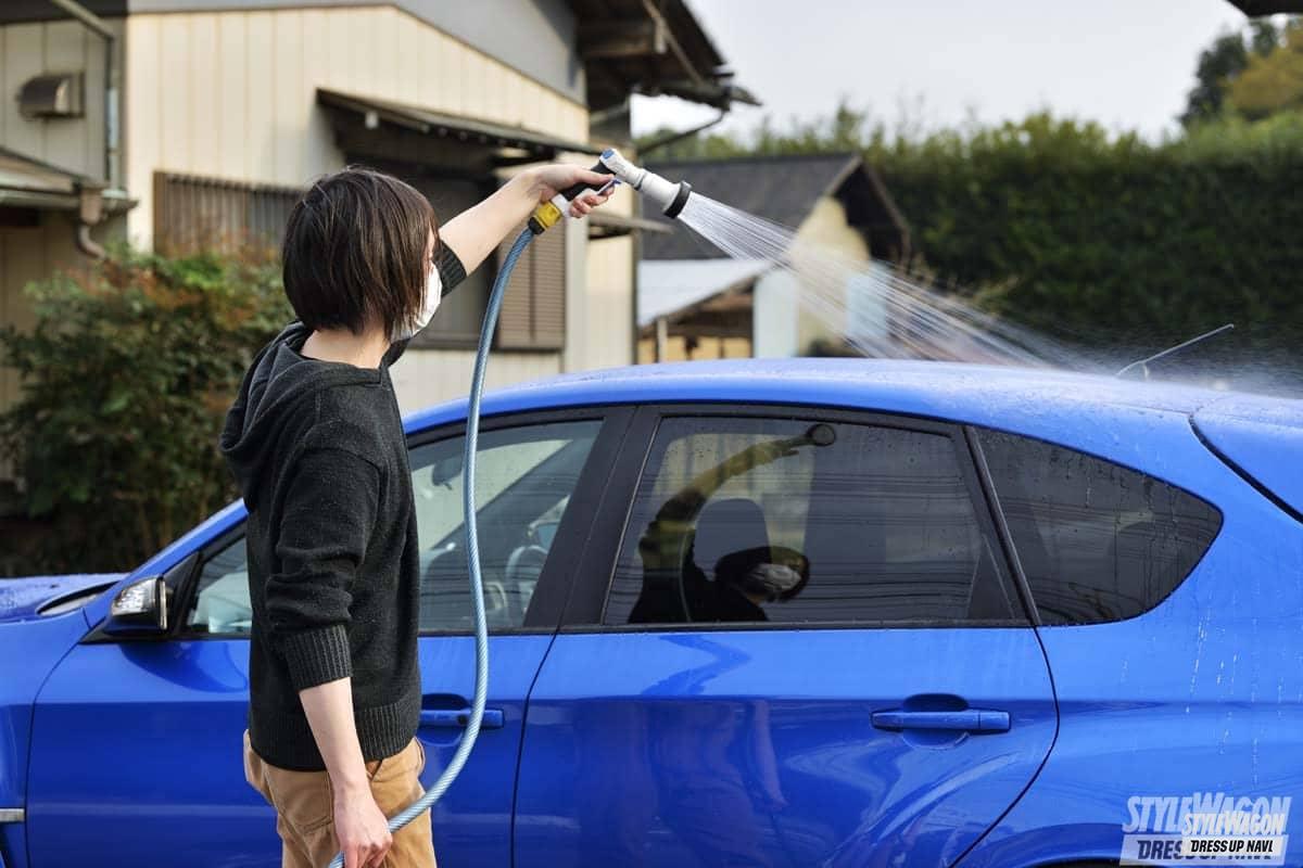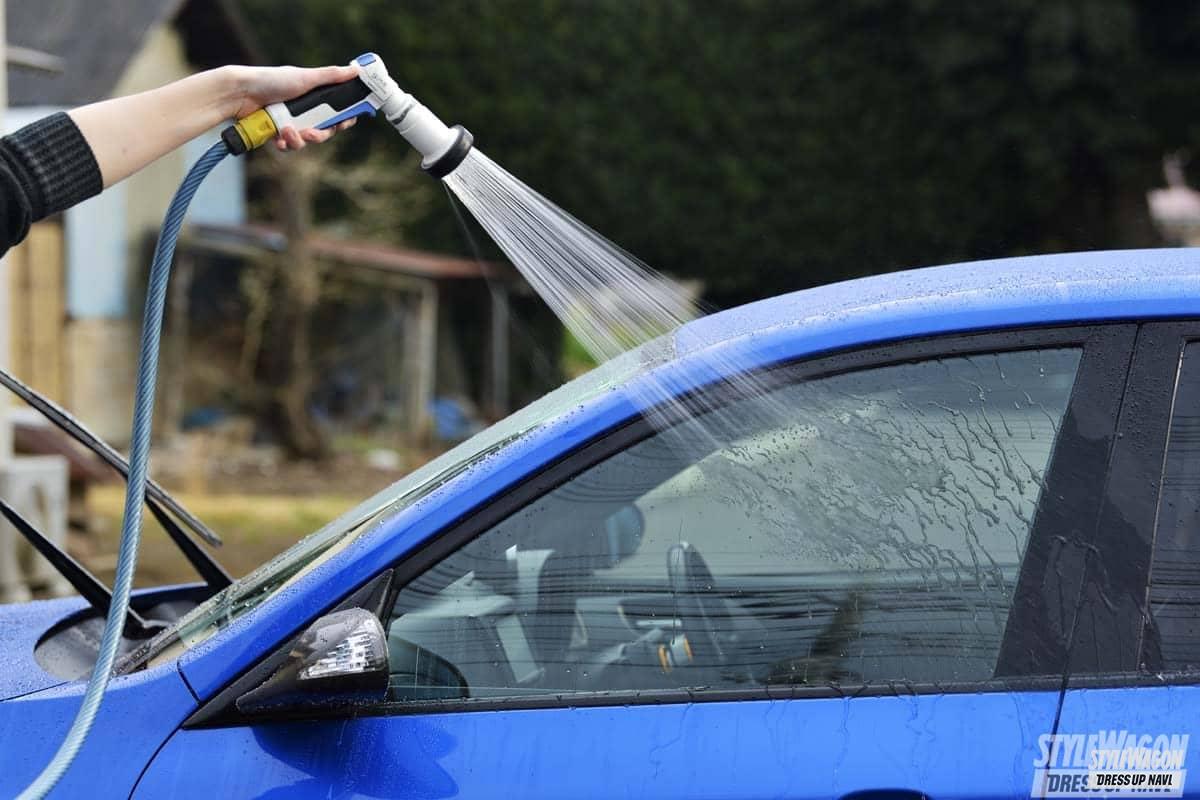 ①まずはしっかりとボディやガラス全体に水を掛けていく。この段階では黄砂を水の流れで軽く落としていく。普段よりしっかりと掛けることを心掛けよう。